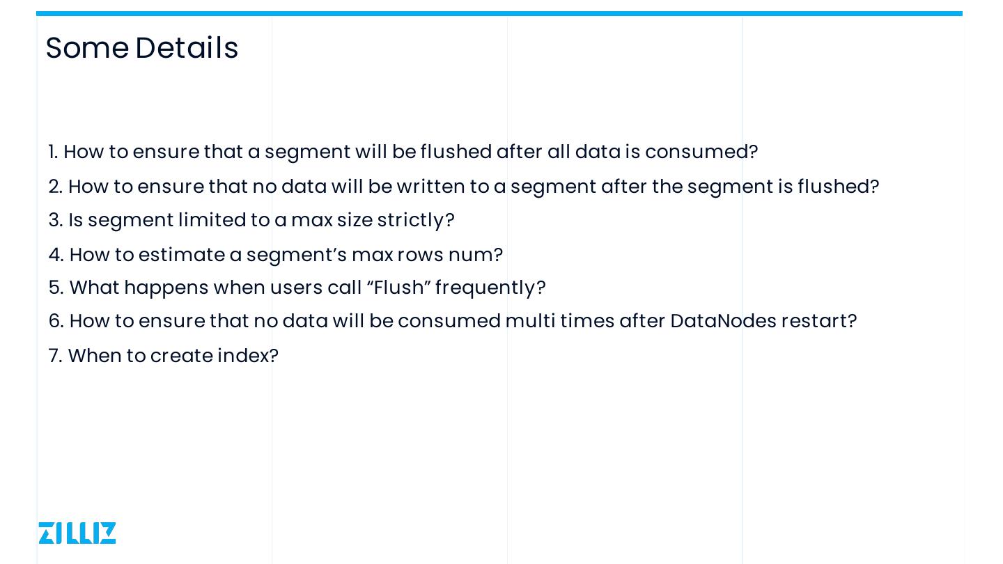21 .Some Details 1. How to ensure that a segment will be flushed after all data is consumed? 2. How to ensure that no data will be written to a segment after the segment is flushed? 3. Is segment limited to a max size strictly? 4. How to estimate a segment’s max rows num? 5. What happens when users call “Flush” frequently? 6. How to ensure that no data will be consumed multi times after DataNodes restart? 7. When to create index?