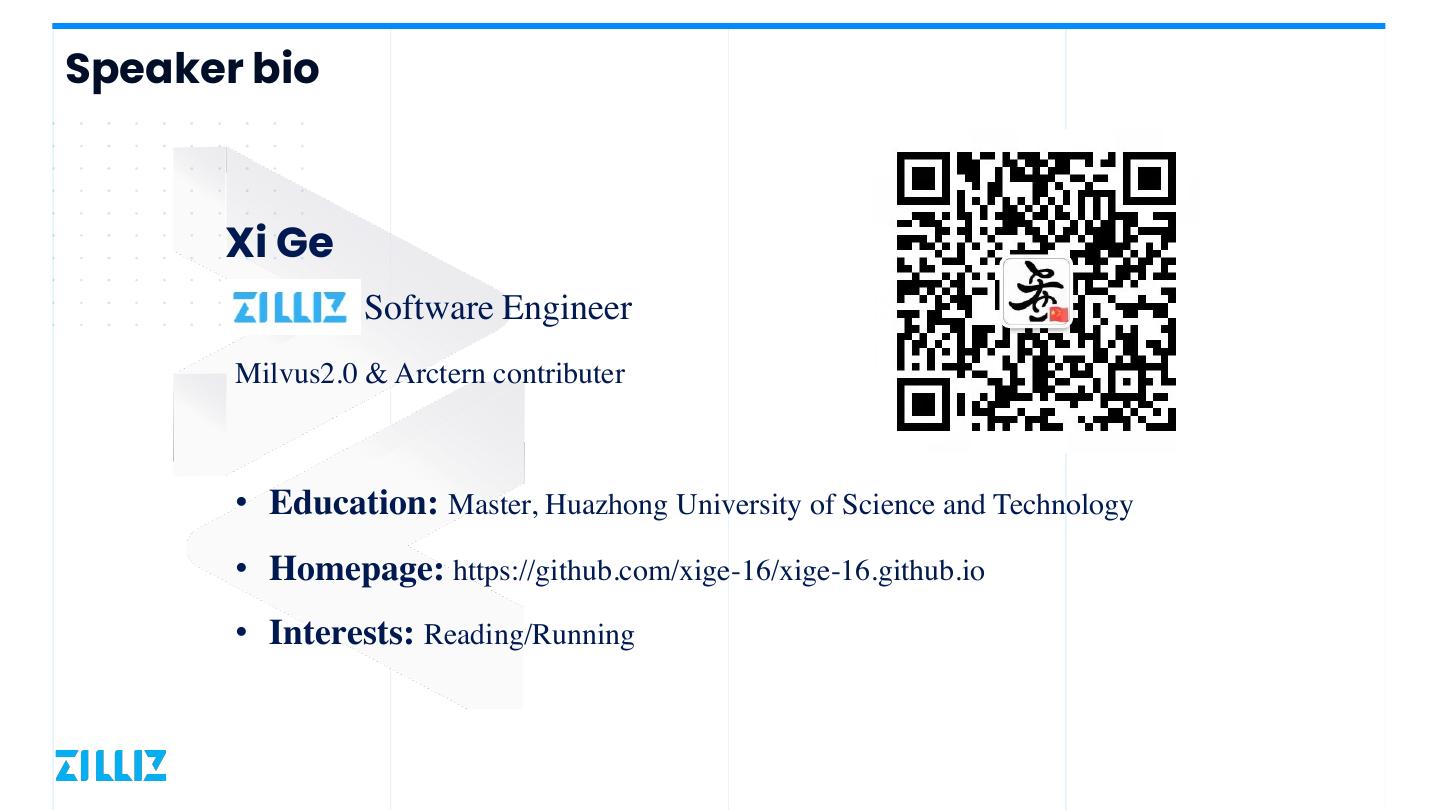 2 .Speaker bio Xi Ge Software Engineer Milvus2.0 & Arctern contributer • Education: Master, Huazhong University of Science and Technology • Homepage: https://github.com/xige-16/xige-16.github.io • Interests: Reading/Running