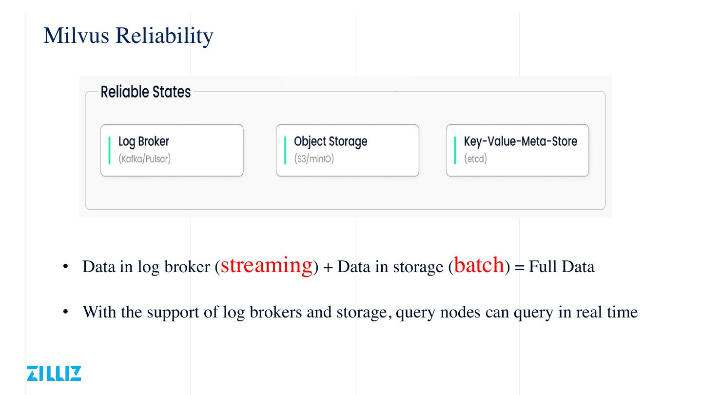 7 .Milvus Reliability • Data in log broker (streaming) + Data in storage (batch) = Full Data • With the support of log brokers and storage, query nodes can query in real time