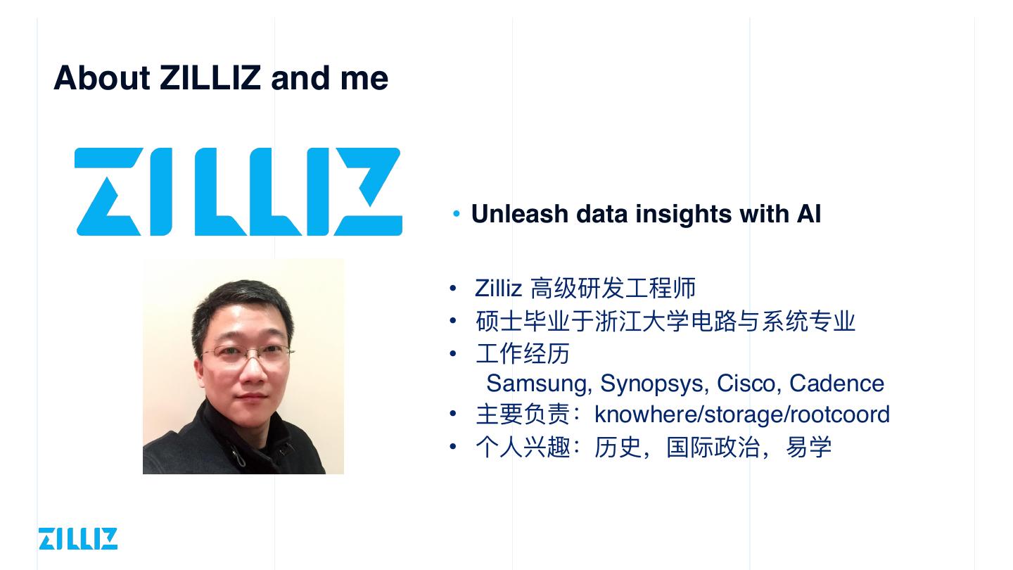 2 .About ZILLIZ and me • Unleash data insights with AI • Zilliz ⾼级研发⼯程师 • 硕⼠毕业于浙江⼤学电路与系统专业 • ⼯作经历 Samsung, Synopsys, Cisco, Cadence • 主要负责:knowhere/storage/rootcoord • 个⼈兴趣:历史,国际政治,易学
