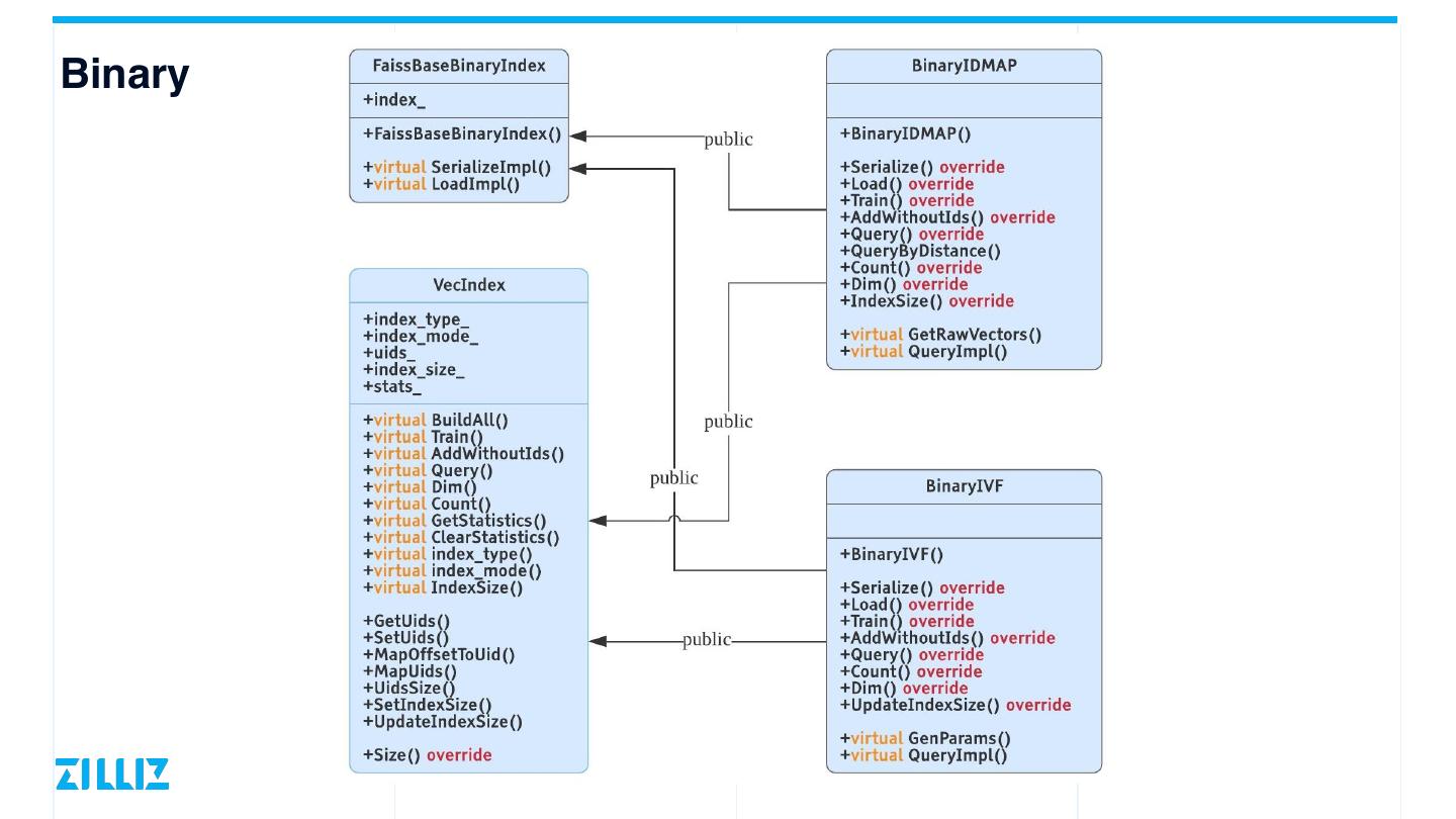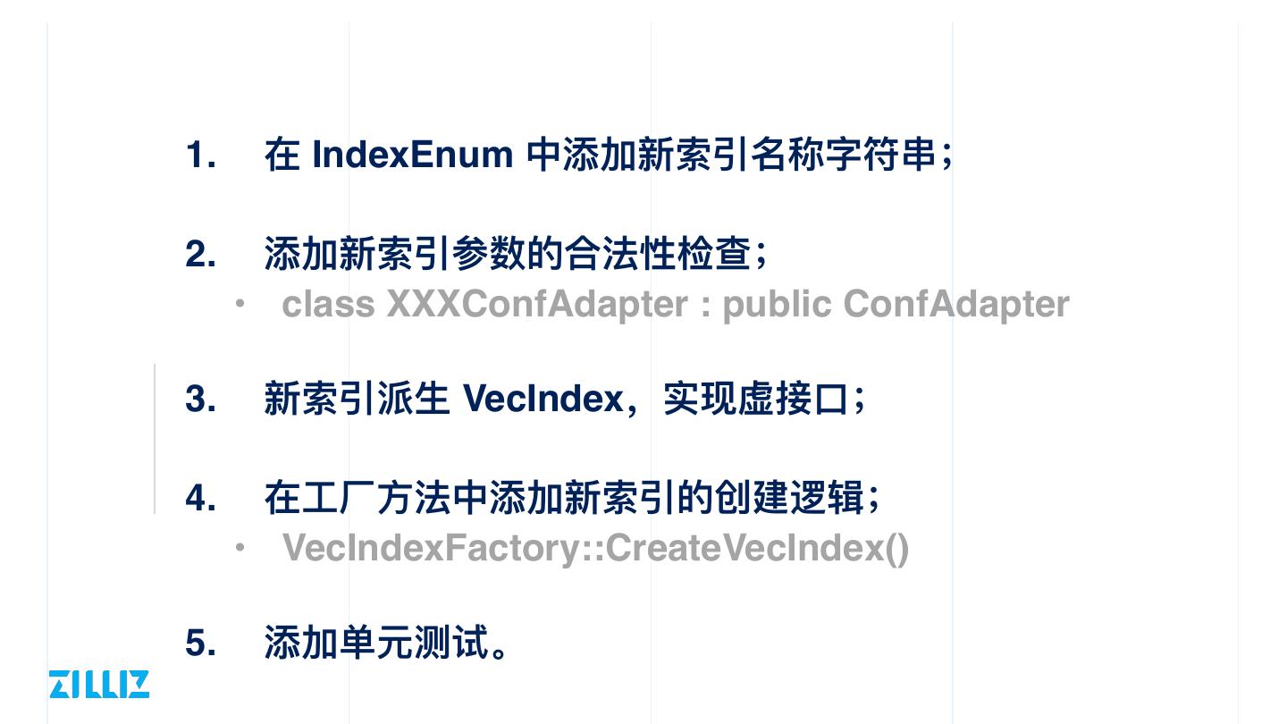 18 .1. 在 IndexEnum 中添加新索引名称字符串; 2. 添加新索引参数的合法性检查; • class XXXConfAdapter : public ConfAdapter 3. 新索引派⽣ VecIndex,实现虚接⼝; 4. 在⼯⼚⽅法中添加新索引的创建逻辑; • VecIndexFactory::CreateVecIndex() 5. 添加单元测试。
