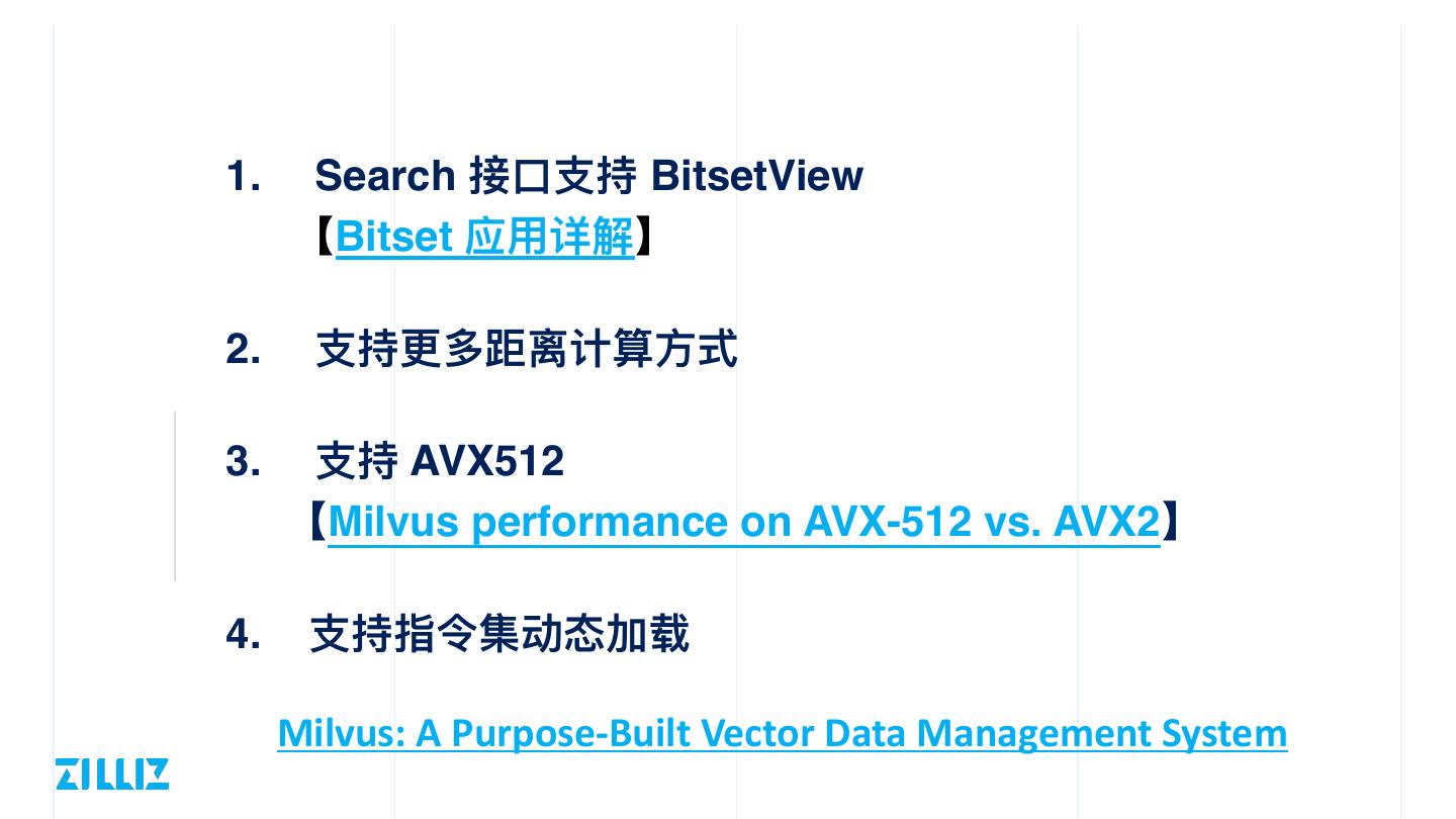 20 .1. Search 接⼝⽀持 BitsetView 【Bitset 应⽤详解】 2. ⽀持更多距离计算⽅式 3. ⽀持 AVX512 【Milvus performance on AVX-512 vs. AVX2】 4. ⽀持指令集动态加载 Milvus: A Purpose-Built Vector Data Management System