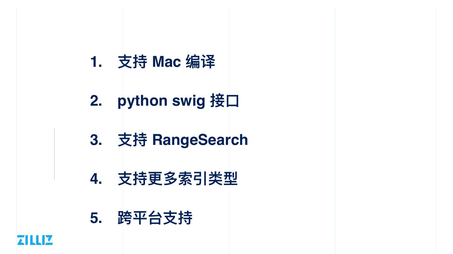 22 .1. ⽀持 Mac 编译 2. python swig 接⼝ 3. ⽀持 RangeSearch 4. ⽀持更多索引类型 5. 跨平台⽀持