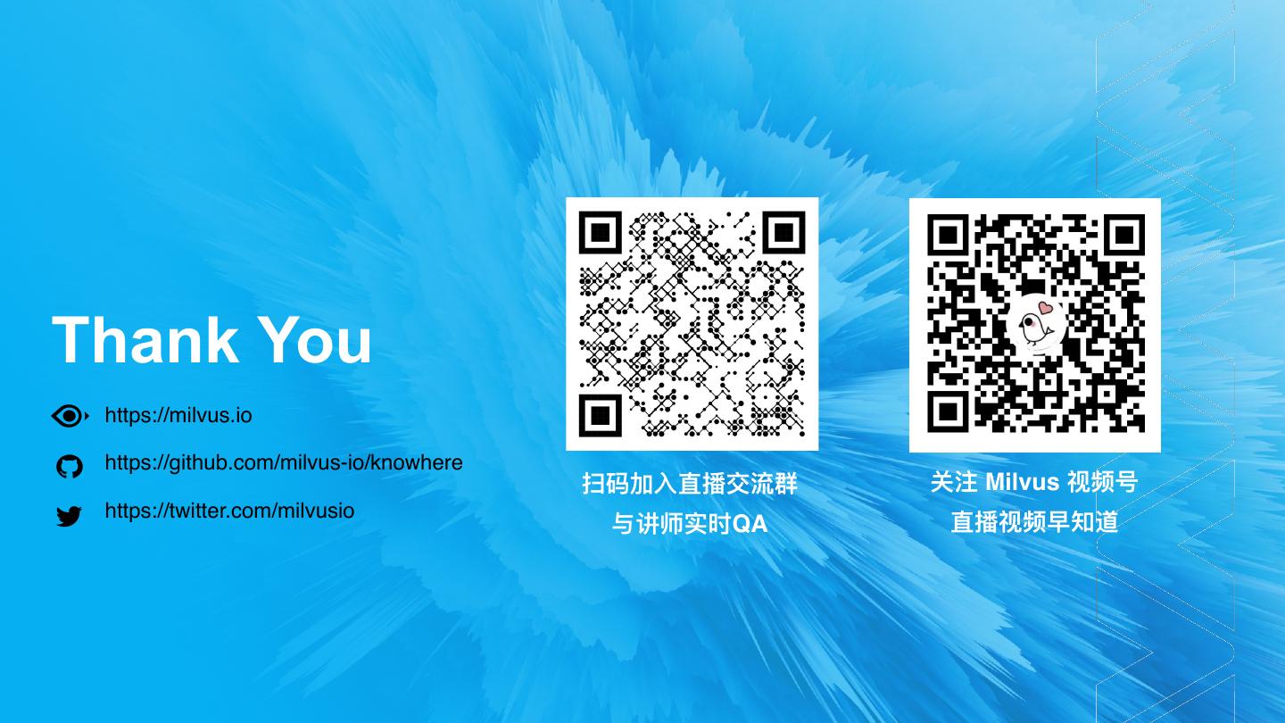 23 .Thank You https://milvus.io https://github.com/milvus-io/knowhere 扫码加⼊直播交流群 关注 Milvus 视频号 https://twitter.com/milvusio 与讲师实时QA 直播视频早知道