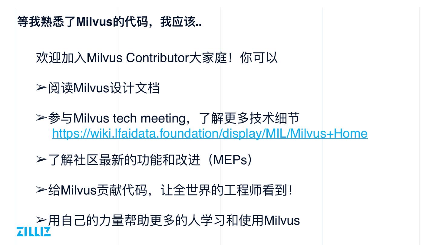 24 .等我熟悉了Milvus的代码,我应该.. 欢迎加⼊Milvus Contributor⼤家庭!你可以 ➢ 阅读Milvus设计⽂档 ➢ 参与Milvus tech meeting,了解更多技术细节 https://wiki.lfaidata.foundation/display/MIL/Milvus+Home ➢ 了解社区最新的功能和改进(MEPs) ➢ 给Milvus贡献代码,让全世界的⼯程师看到! ➢ ⽤⾃⼰的⼒量帮助更多的⼈学习和使⽤Milvus