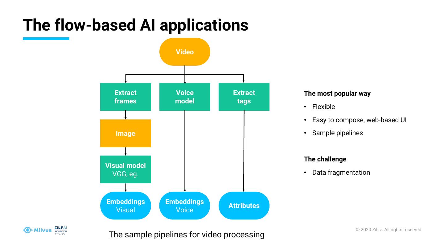 3 .The flow-based AI applications Video Extract Voice Extract The most popular way frames model tags • Flexible • Easy to compose, web-based UI Image • Sample pipelines The challenge Visual model VGG, eg. • Data fragmentation Embeddings Embeddings Attributes Visual Voice © 2020 Zilliz. All rights reserved. The sample pipelines for video processing