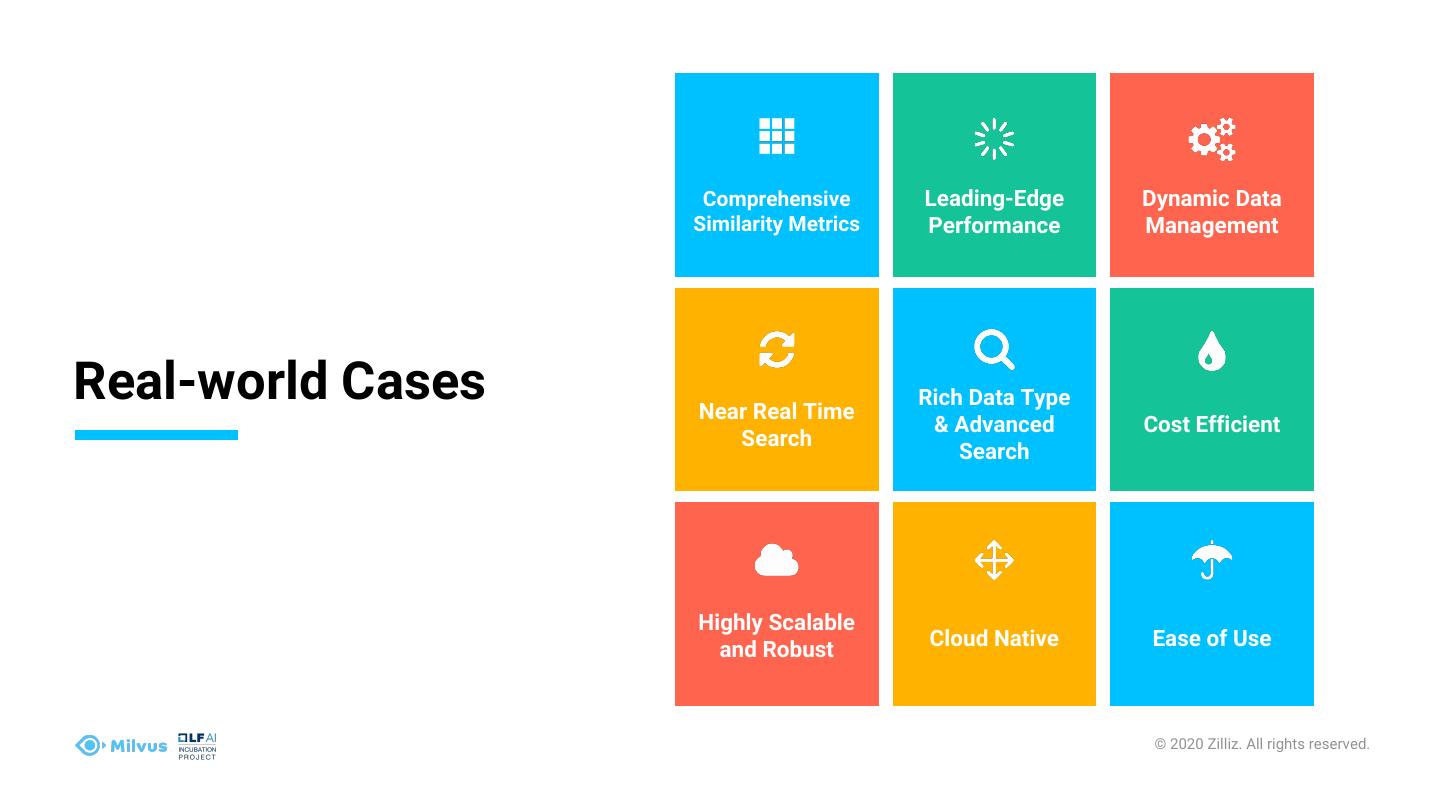 8 . Comprehensive Leading-Edge Dynamic Data Similarity Metrics Performance Management Real-world Cases Near Real Time Rich Data Type & Advanced Cost Efficient Search Search Highly Scalable and Robust Cloud Native Ease of Use © 2020 Zilliz. All rights reserved.