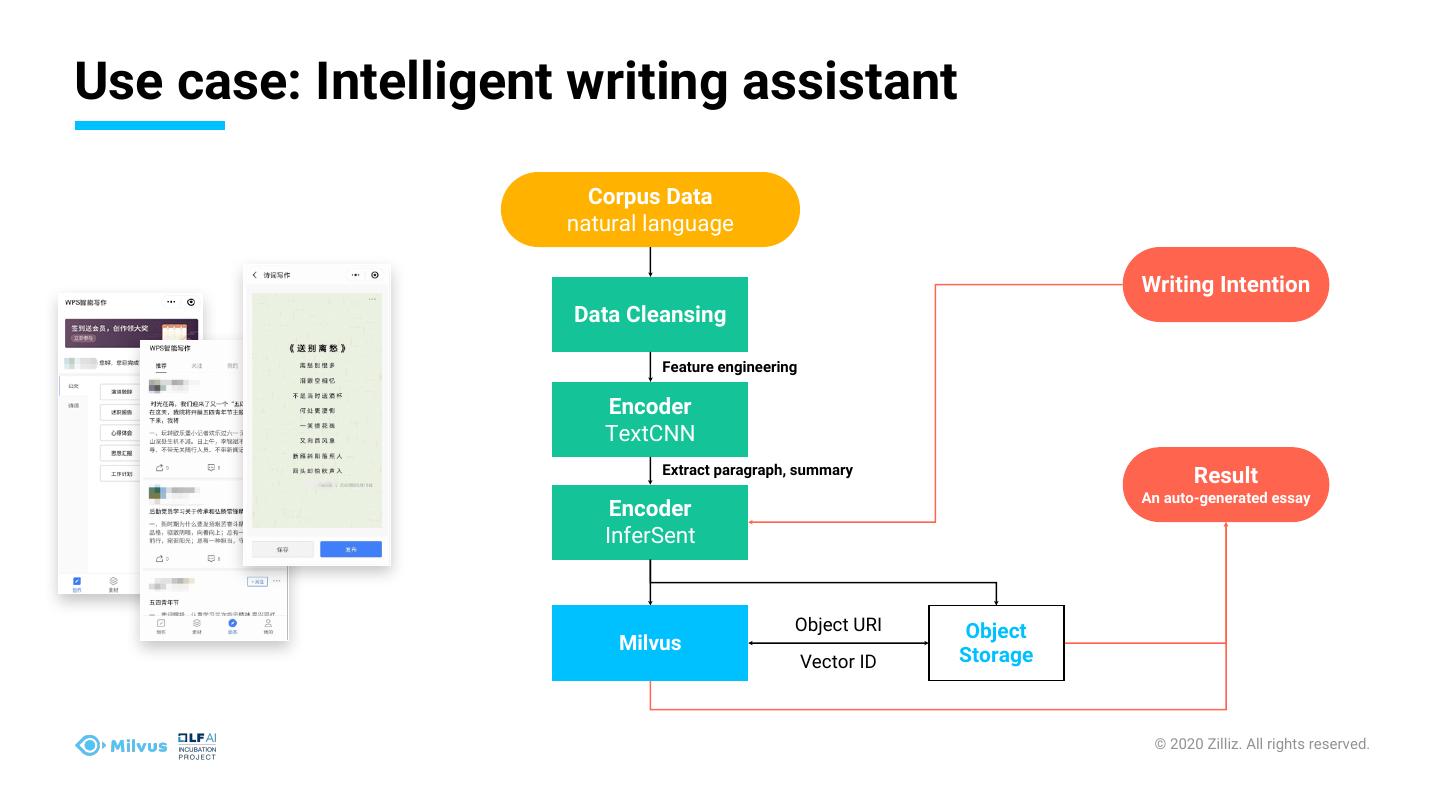 9 .Use case: Intelligent writing assistant Corpus Data natural language Writing Intention Data Cleansing Feature engineering Encoder TextCNN Extract paragraph, summary Result An auto-generated essay Encoder InferSent Object URI Object Milvus Vector ID Storage © 2020 Zilliz. All rights reserved.