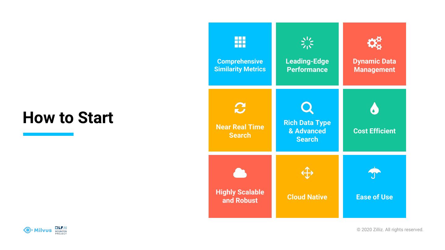 19 . Comprehensive Leading-Edge Dynamic Data Similarity Metrics Performance Management The OSS Community Near Real Time Rich Data Type & Advanced Cost Efficient Search Search Highly Scalable and Robust Cloud Native Ease of Use © 2020 Zilliz. All rights reserved.