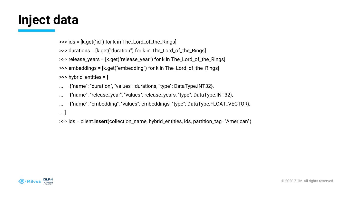 17 .Inject data >>> ids = [k.get("id") for k in The_Lord_of_the_Rings] >>> durations = [k.get("duration") for k in The_Lord_of_the_Rings] >>> release_years = [k.get("release_year") for k in The_Lord_of_the_Rings] >>> embeddings = [k.get("embedding") for k in The_Lord_of_the_Rings] >>> hybrid_entities = [ ... {"name": "duration", "values": durations, "type": DataType.INT32}, ... {"name": "release_year", "values": release_years, "type": DataType.INT32}, ... {"name": "embedding", "values": embeddings, "type": DataType.FLOAT_VECTOR}, ... ] >>> ids = client.insert(collection_name, hybrid_entities, ids, partition_tag="American") © 2020 Zilliz. All rights reserved.