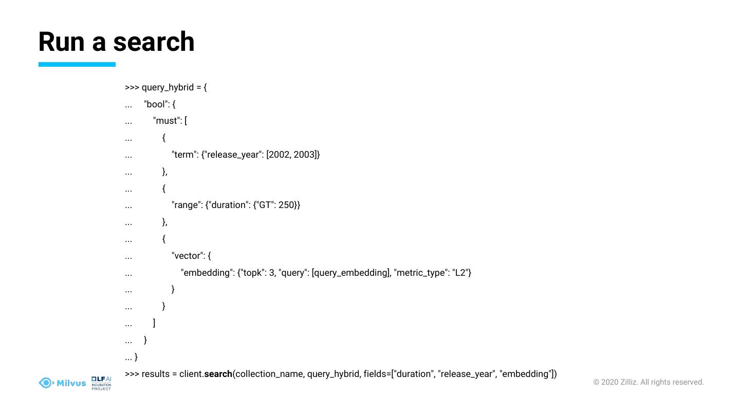 18 .Run a search >>> query_hybrid = { ... "bool": { ... "must": [ ... { ... "term": {"release_year": [2002, 2003]} ... }, ... { ... "range": {"duration": {"GT": 250}} ... }, ... { ... "vector": { ... "embedding": {"topk": 3, "query": [query_embedding], "metric_type": "L2"} ... } ... } ... ] ... } ... } >>> results = client.search(collection_name, query_hybrid, fields=["duration", "release_year", "embedding"]) © 2020 Zilliz. All rights reserved.