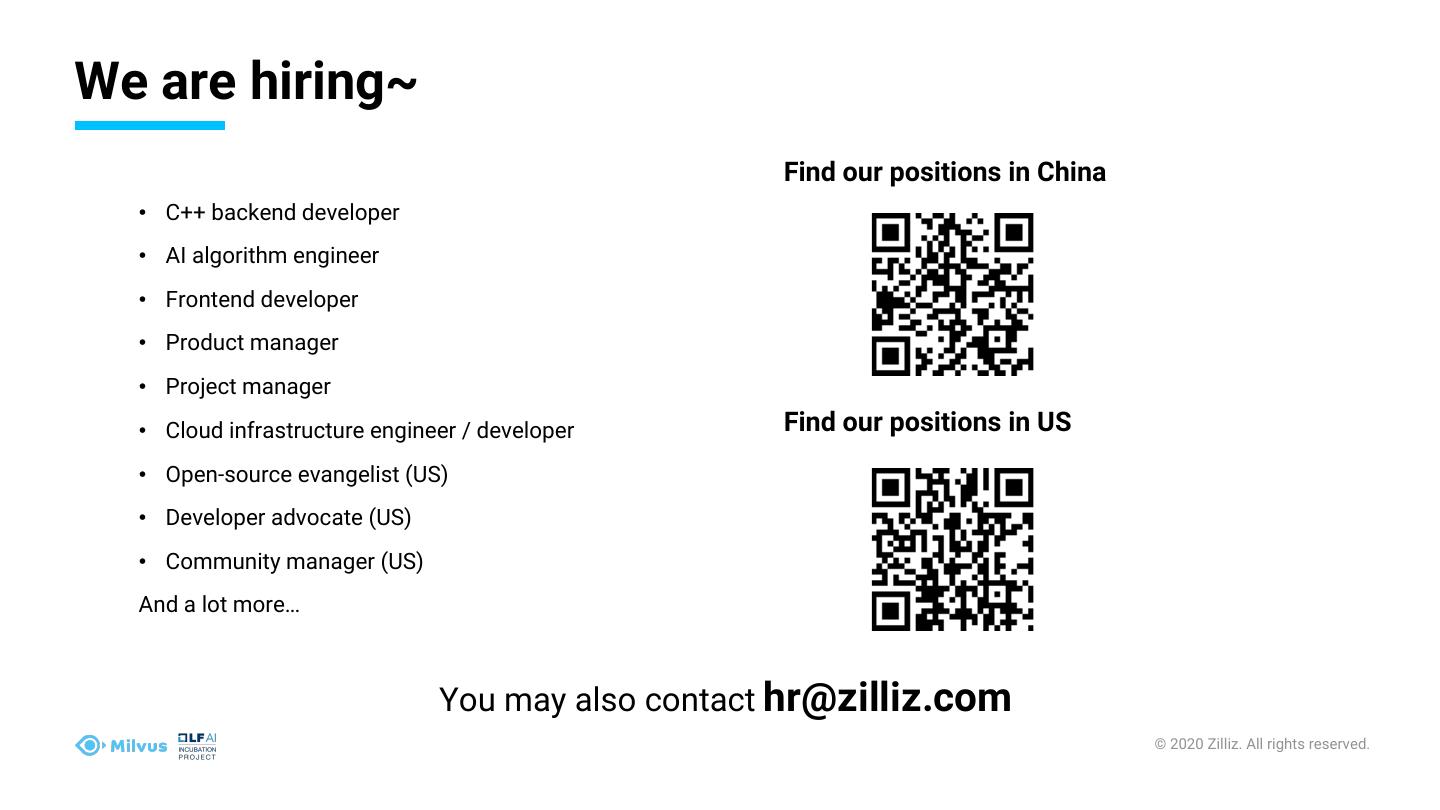 23 .We are hiring~ Find our positions in China • C++ backend developer • AI algorithm engineer • Frontend developer • Product manager • Project manager • Cloud infrastructure engineer / developer Find our positions in US • Open-source evangelist (US) • Developer advocate (US) • Community manager (US) And a lot more… You may also contact hr@zilliz.com © 2020 Zilliz. All rights reserved.