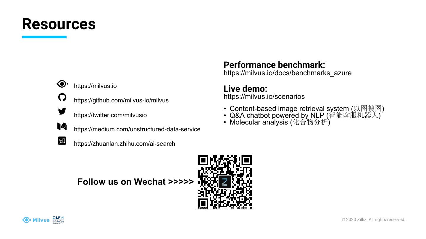 24 .Resources Performance benchmark: https://milvus.io/docs/benchmarks_azure https://milvus.io Live demo: https://github.com/milvus-io/milvus https://milvus.io/scenarios • Content-based image retrieval system (以图搜图) https://twitter.com/milvusio • Q&A chatbot powered by NLP (智能客服机器人) • Molecular analysis (化合物分析) https://medium.com/unstructured-data-service https://zhuanlan.zhihu.com/ai-search Follow us on Wechat >>>>> © 2020 Zilliz. All rights reserved.