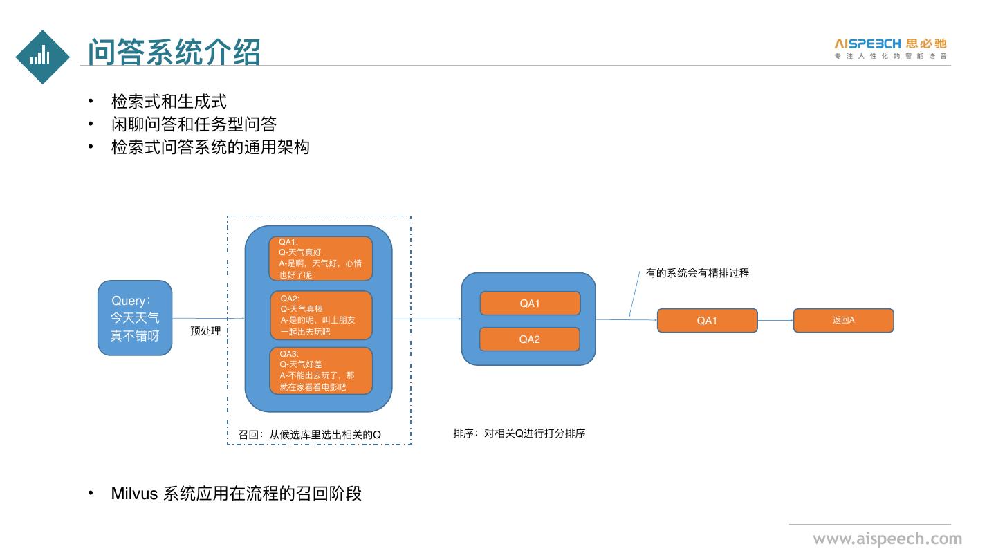 3 .问答系统介绍 • 检索式和⽣成式 • 闲聊问答和任务型问答 • 检索式问答系统的通⽤架构 QA1: Q-天⽓真好 A-是啊,天⽓好,⼼情 也好了呢 有的系统会有精排过程 Query: QA2: Q-天⽓真棒 QA1 今天天⽓ A-是的呢,叫上朋友 QA1 返回A 真不错呀 预处理 ⼀起出去玩吧 QA2 QA3: Q-天⽓好差 A-不能出去玩了,那 就在家看看电影吧 召回:从候选库⾥选出相关的Q 排序:对相关Q进⾏打分排序 • Milvus 系统应⽤在流程的召回阶段 www.aispeech.com
