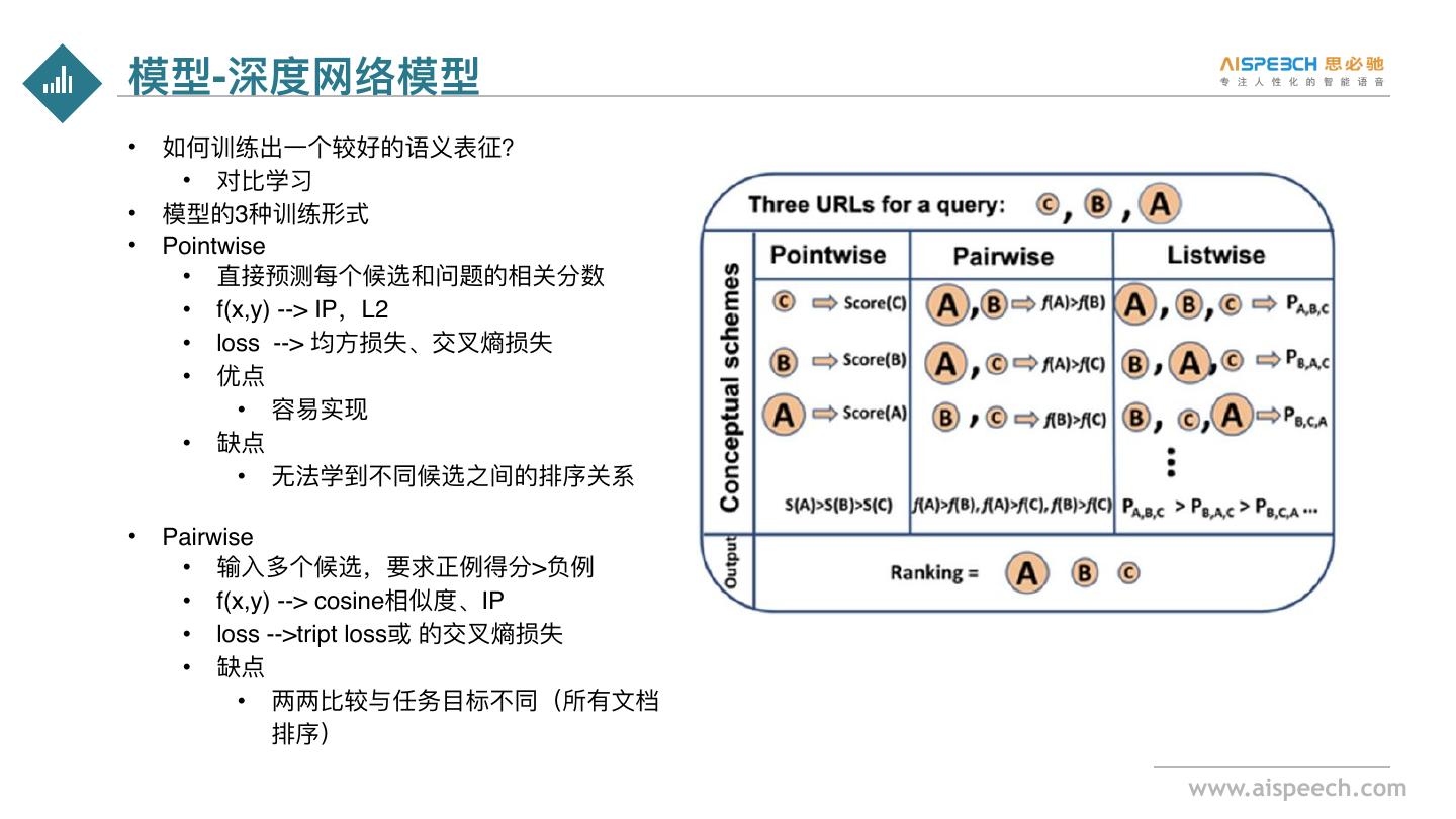 7 .模型-深度⽹络模型 • Listwise • 输⼊多个候选,要求候选得分顺序正确的 概率最⼤ • f(x,y) --> cosine、IP • 通常数据集只有正例和负例,不可能有标注 score(A)>score(B)>score(C)。 • 表现形式更像是多个Pairwise。 这⾥我们使⽤pairwise www.aispeech.com
