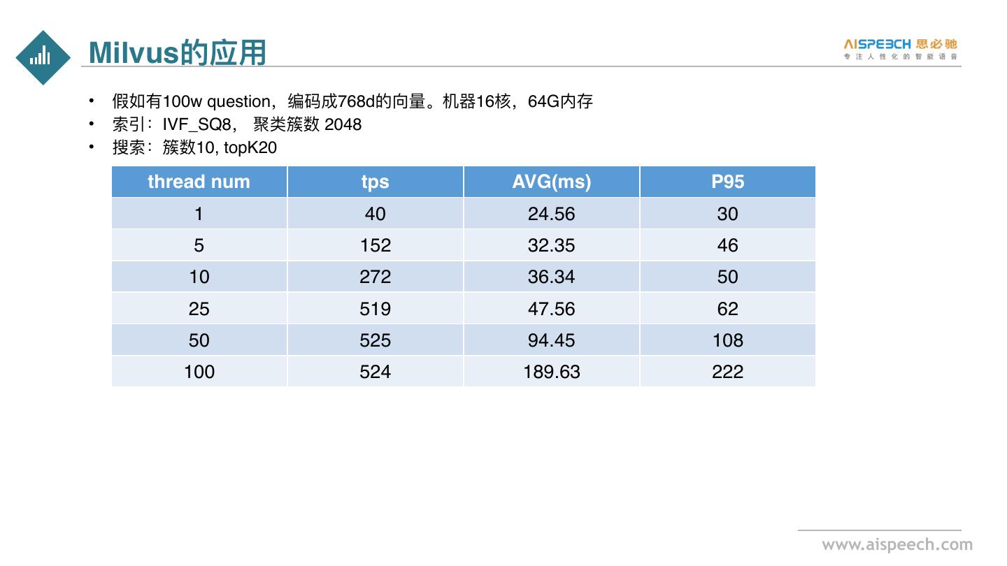 11 .Milvus的应⽤ • 假如有100w question,编码成768d的向量。机器16核,64G内存 • 索引:IVF_SQ8, 聚类簇数 2048 • 搜索:簇数10, topK20 thread num tps AVG(ms) P95 1 40 24.56 30 5 152 32.35 46 10 272 36.34 50 25 519 47.56 62 50 525 94.45 108 100 524 189.63 222 www.aispeech.com