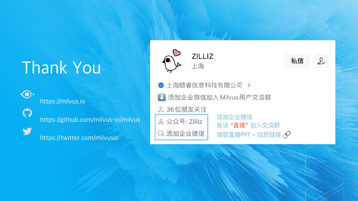 13 .Thank You https://milvus.io https://github.com/milvus-io/milvus 添加企业微信 发送 “直播” 加⼊交流群 领取直播PPT + 回放链接 🔗 https://twitter.com/milvusio