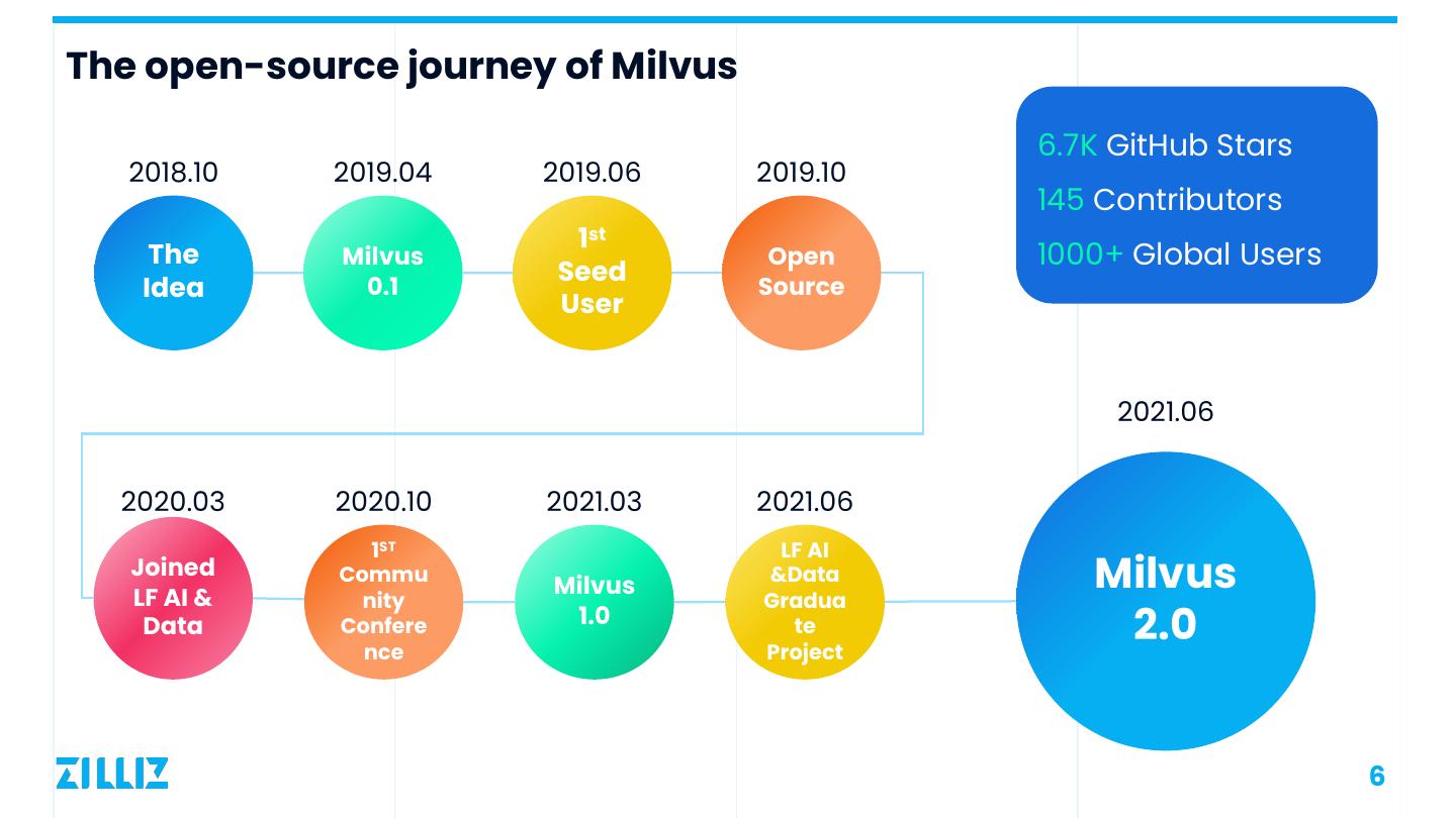 6 .The open-source journey of Milvus 6.7K GitHub Stars 2018.10 2019.04 2019.06 2019.10 145 Contributors 1st The Milvus Open 1000+ Global Users Seed Idea 0.1 Source User 2021.06 2020.03 2020.10 2021.03 2021.06 1ST LF AI Joined LF AI & Commu nity Milvus &Data Gradua Milvus Data Confere nce 1.0 te Project 2.0 6