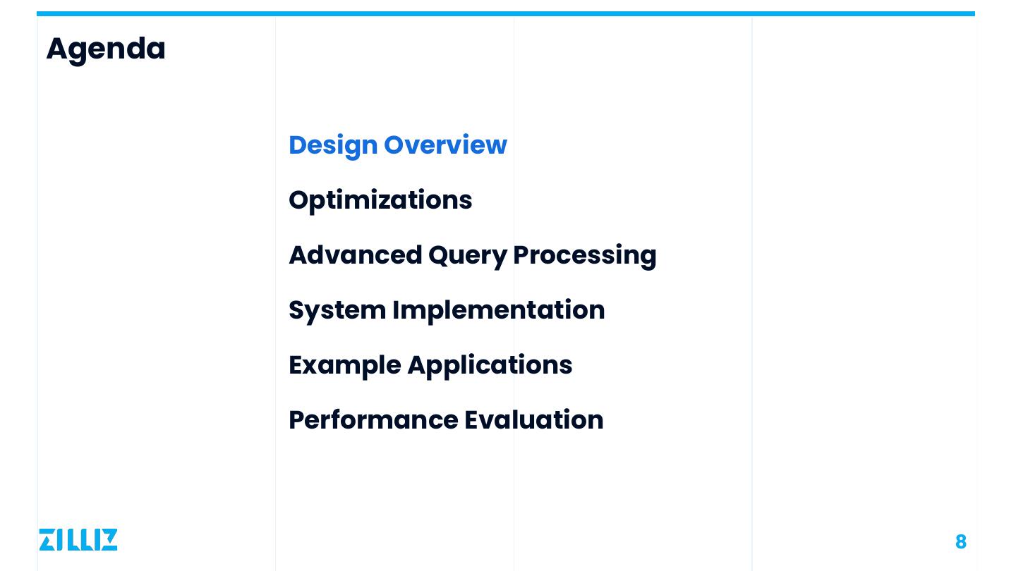 7 .Common User Requirements Efforts in Milvus Efficiency: § SIMD & Cache based optimization § Large data volume § Heterogenous computing § Dynamic data management § LSM tree § Snapshot isolation § Execution plan optimization Advanced query semantic: § Vector fusion § Vector similarity search § Iterative merging algorithm § Attribute filtering § Distributed data processing § Multi-vector search § Easy-to-use interfaces 7