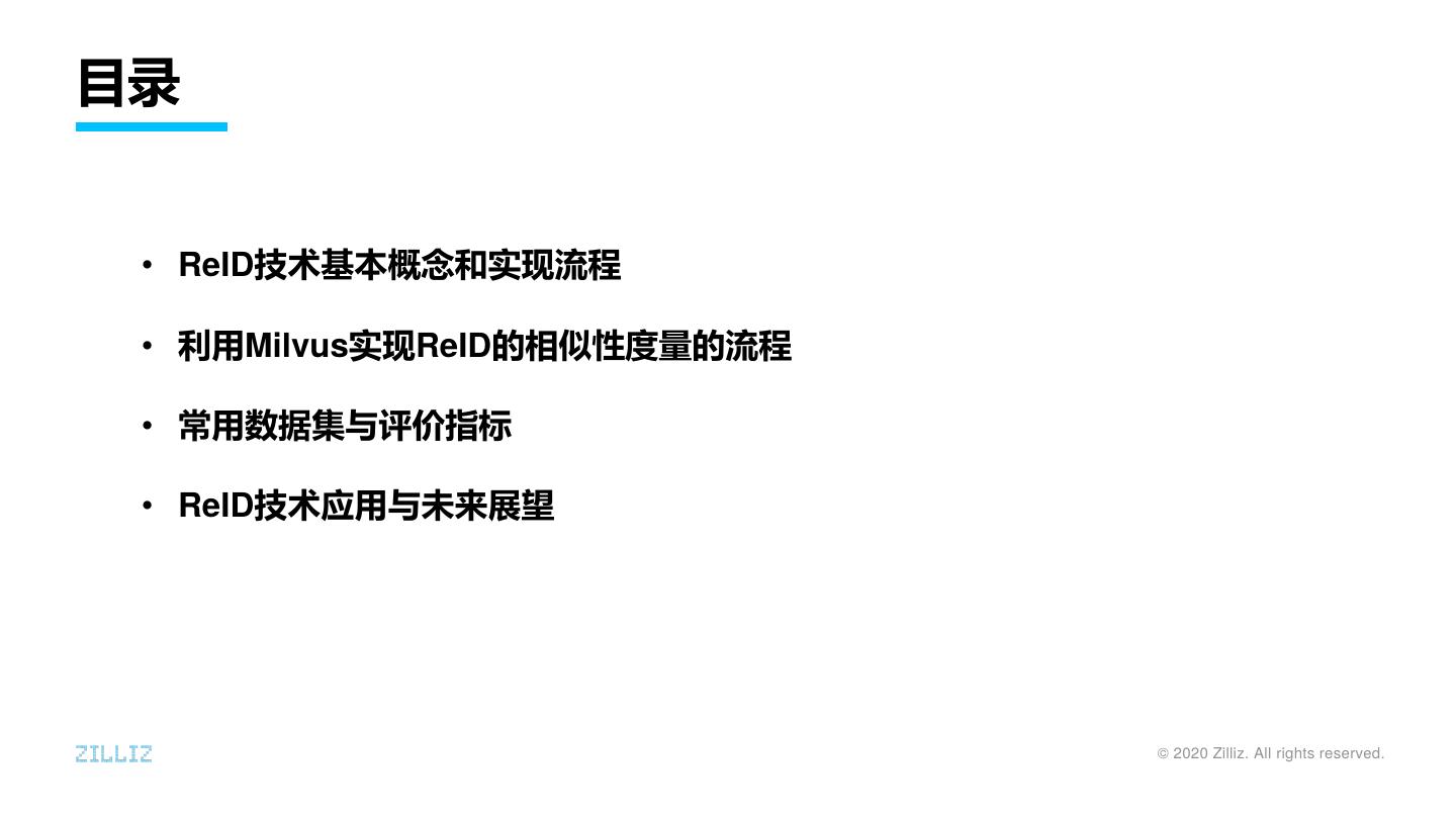 3 .目录 • ReID技术基本概念和实现流程 • 利用Milvus实现ReID的相似性度量的流程 • 常用数据集与评价指标 • ReID技术应用与未来展望 © 2020 Zilliz. All rights reserved.