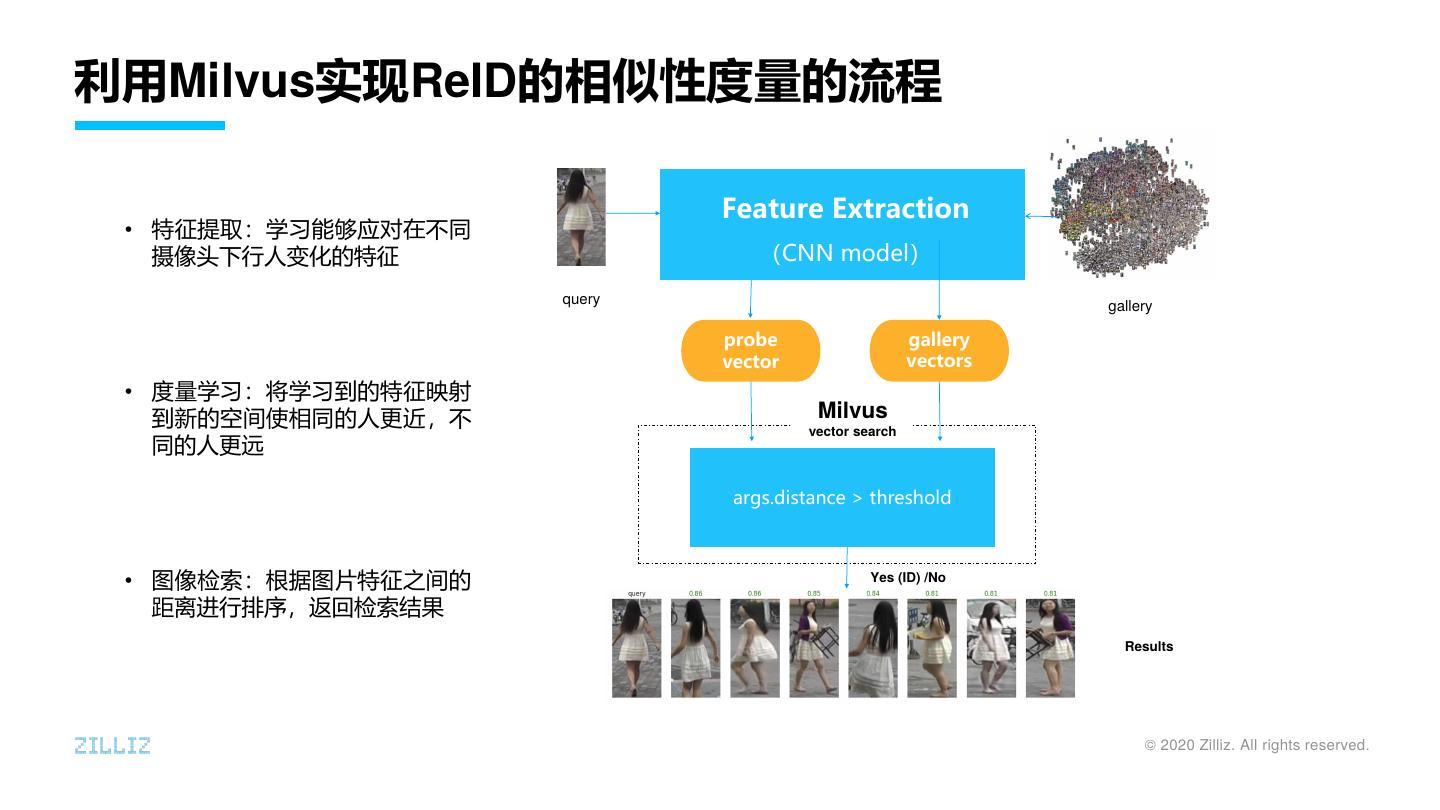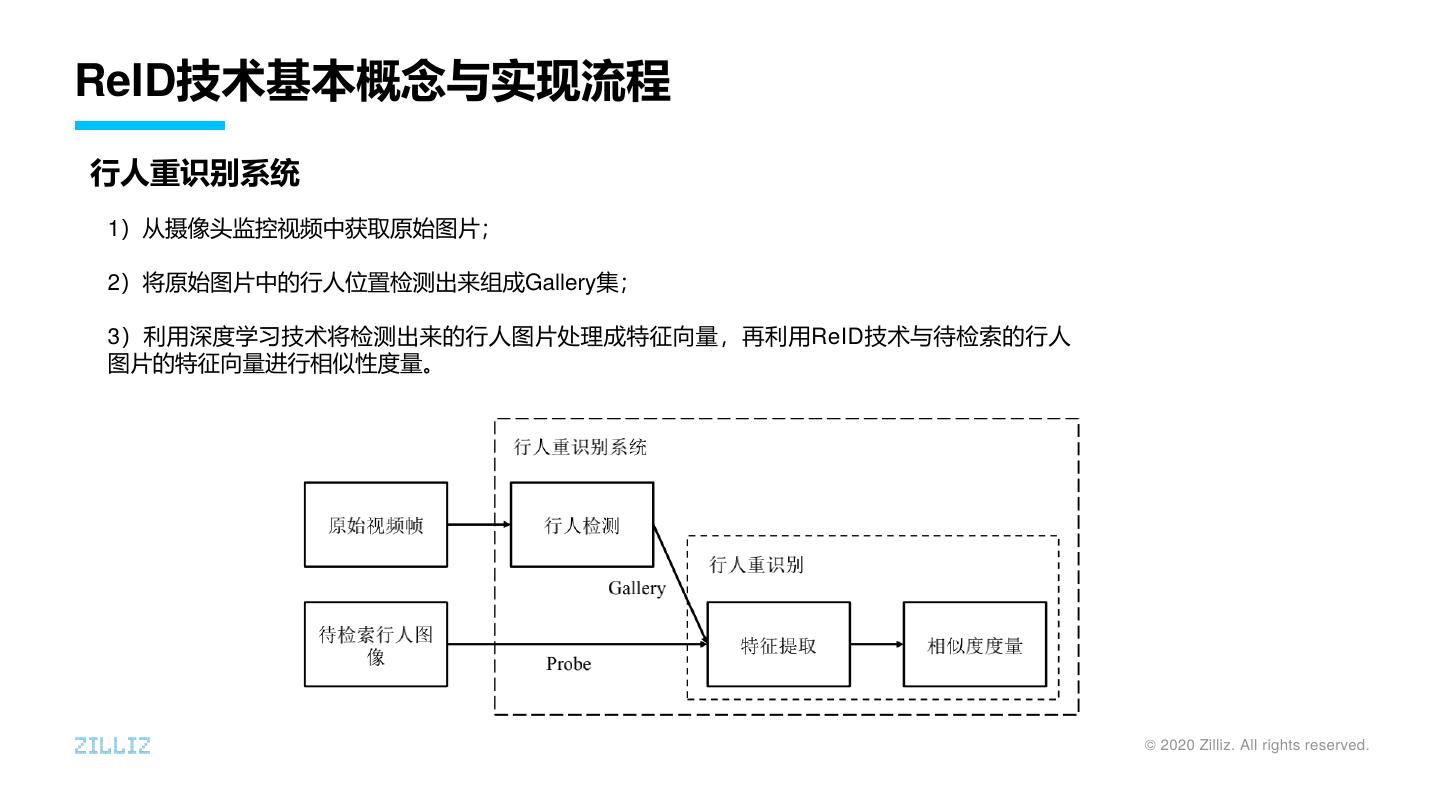 9 .ReID技术基本概念与实现流程 行人重识别系统 1)从摄像头监控视频中获取原始图片; 2)将原始图片中的行人位置检测出来组成Gallery集; 3)利用深度学习技术将检测出来的行人图片处理成特征向量,再利用ReID技术与待检索的行人 图片的特征向量进行相似性度量。 © 2020 Zilliz. All rights reserved.