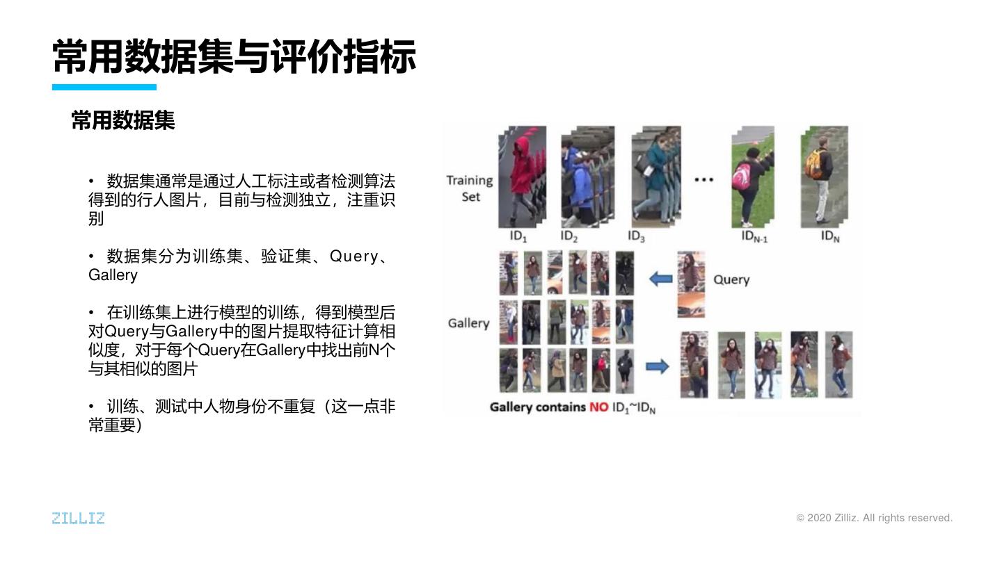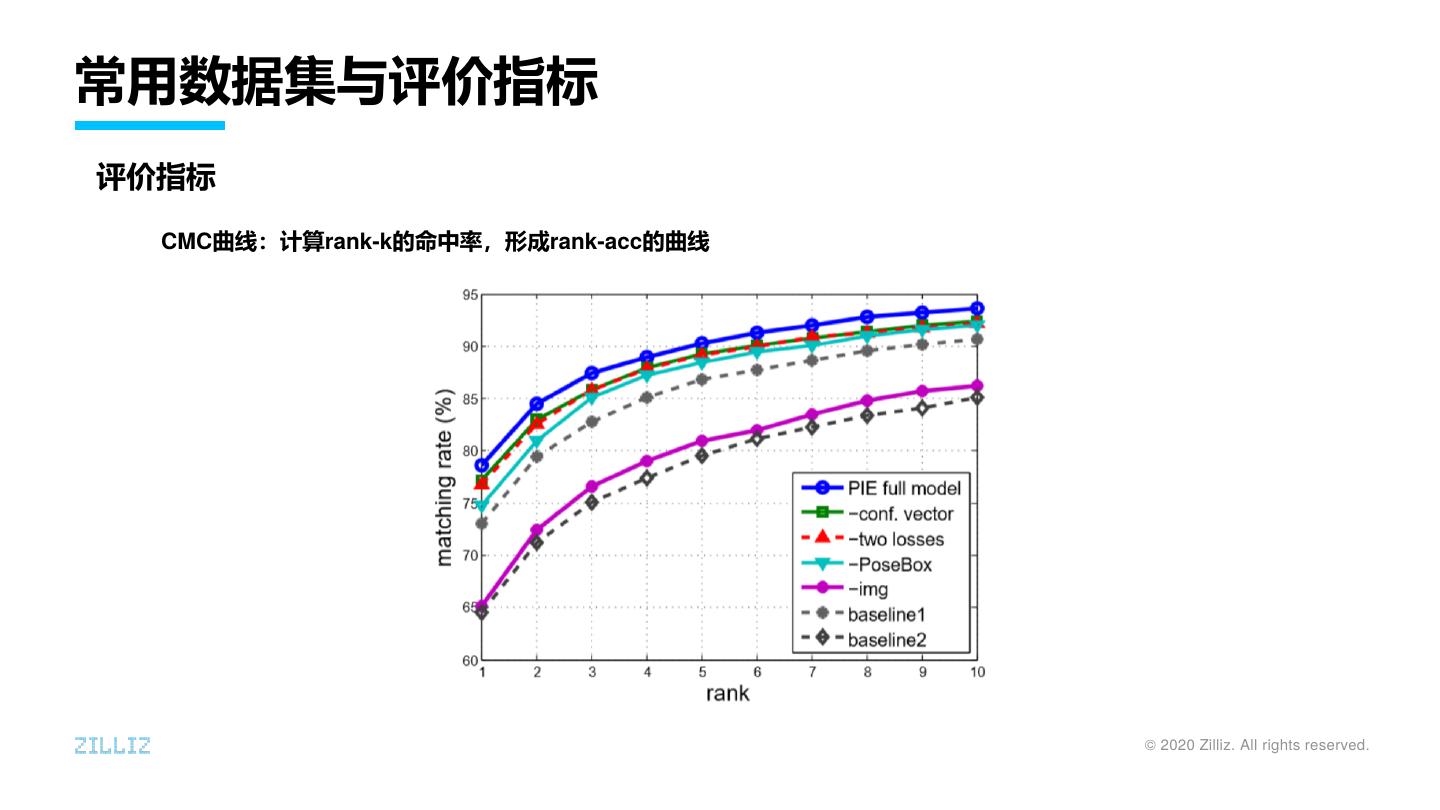 19 .常用数据集与评价指标 评价指标 CMC曲线:计算rank-k的命中率,形成rank-acc的曲线 © 2020 Zilliz. All rights reserved.