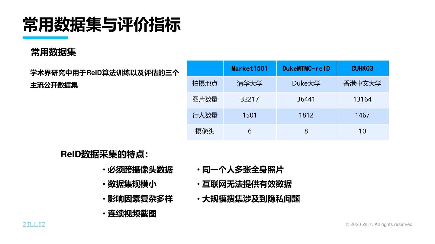 14 .常用数据集与评价指标 常用数据集 Market1501 DukeMTMC-reID CUHK03 学术界研究中用于ReID算法训练以及评估的三个 主流公开数据集 拍摄地点 清华大学 Duke大学 香港中文大学 图片数量 32217 36441 13164 行人数量 1501 1812 1467 摄像头 6 8 10 ReID数据采集的特点: • 必须跨摄像头数据 • 同一个人多张全身照片 • 数据集规模小 • 互联网无法提供有效数据 • 影响因素复杂多样 • 大规模搜集涉及到隐私问题 • 连续视频截图 © 2020 Zilliz. All rights reserved.