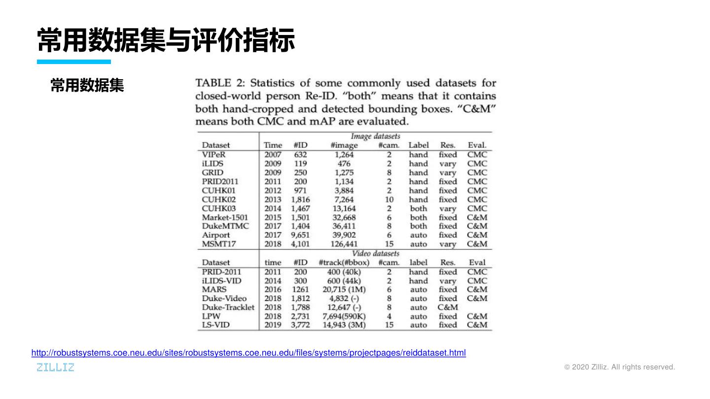 17 .常用数据集与评价指标 令人很期待的COCAS数据集 中科院开发了一个大规模的行人换装数据集COCAS,总共包含5266人的62382张行人图像,不过 遗憾的是还没有开源。下面是论文的地址,该文验证了通过服装模板进行换衣服的行人重识别 是可行的。 https://arxiv.org/abs/2005.07862 © 2020 Zilliz. All rights reserved.