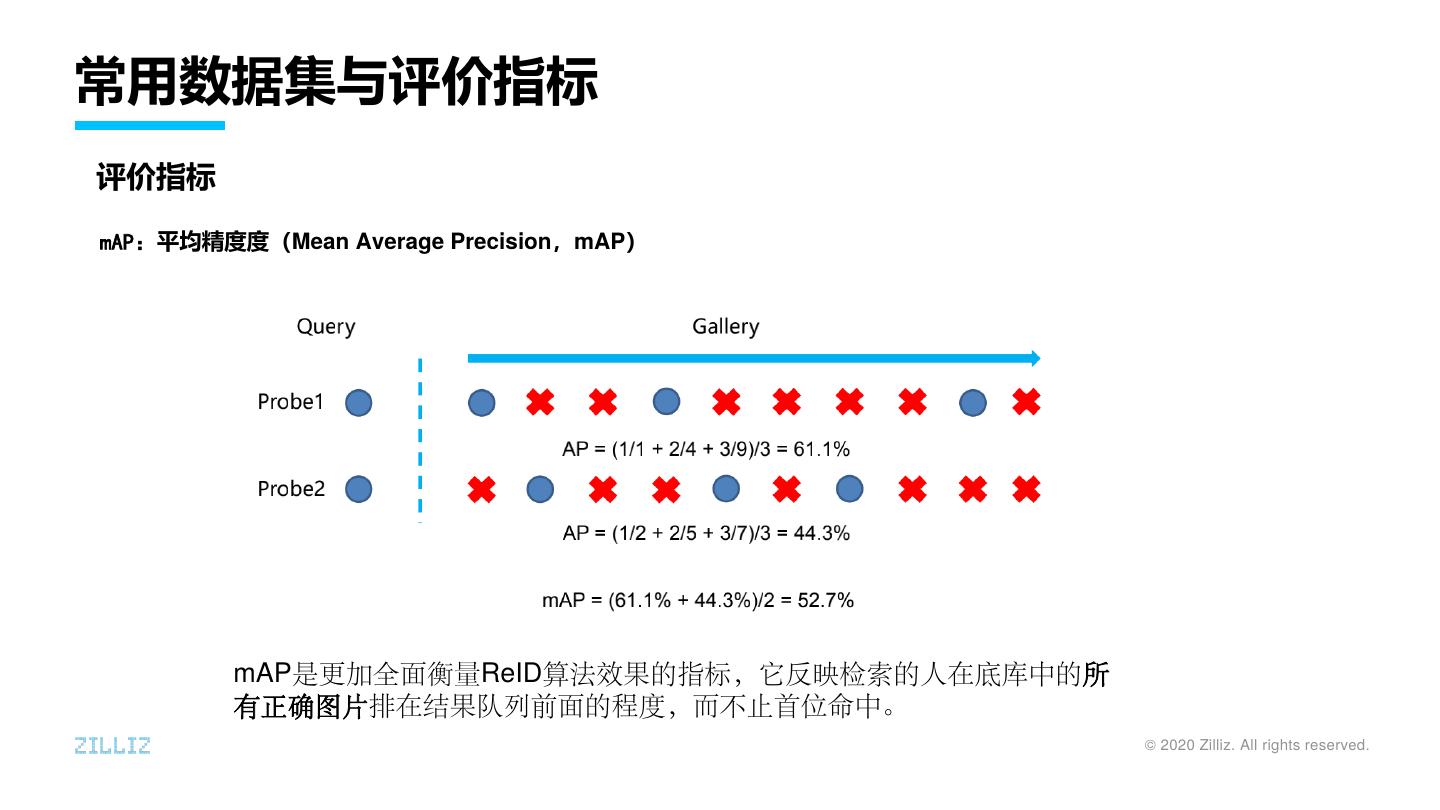 20 .常用数据集与评价指标 评价指标 mAP:平均精度度(Mean Average Precision,mAP) mAP是更加全面衡量ReID算法效果的指标,它反映检索的人在底库中的所 有正确图片排在结果队列前面的程度,而不止首位命中。 © 2020 Zilliz. All rights reserved.