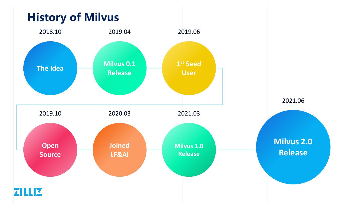 6 .History of Milvus 2018.10 2019.04 2019.06 Milvus 0.1 1st Seed The Idea Release User 2021.06 2019.10 2020.03 2021.03 Open Joined Milvus 1.0 Milvus 2.0 Source LF&AI Release Release