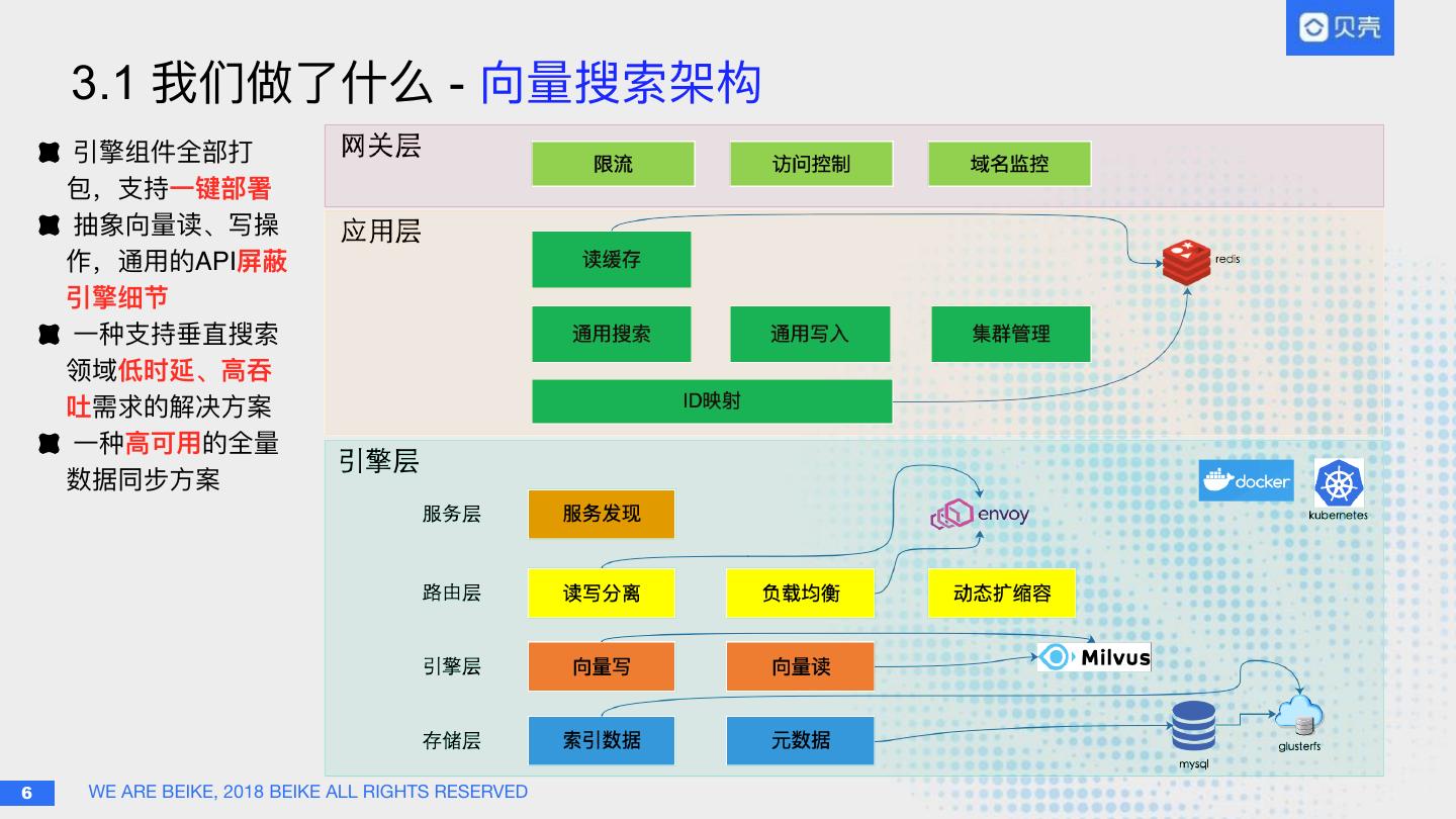 5 . 2.2 技术选型 - why milvus ? 对faiss、annoy开源库进 ⾏了定制 开箱即⽤,读写分离,⽀ 持⾼可⽤部署 ⽀持多属性、多索引类型 ⽀持多种处理器 ⽀持百亿级数据搜索 活跃的社区,专业的团队 ⽀持 5 WE ARE BEIKE, 2018 BEIKE ALL RIGHTS RESERVED