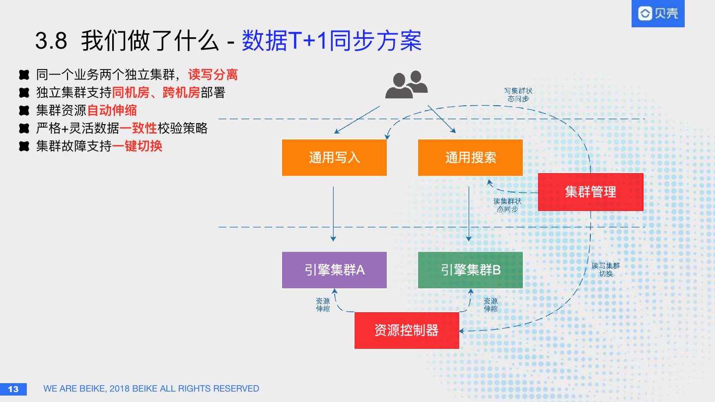 13 . 3.8 我们做了什么 - 数据T+1同步⽅案 同⼀个业务两个独⽴集群,读写分离 独⽴集群⽀持同机房、跨机房部署 集群资源⾃动伸缩 严格+灵活数据⼀致性校验策略 集群故障⽀持⼀键切换 13 WE ARE BEIKE, 2018 BEIKE ALL RIGHTS RESERVED