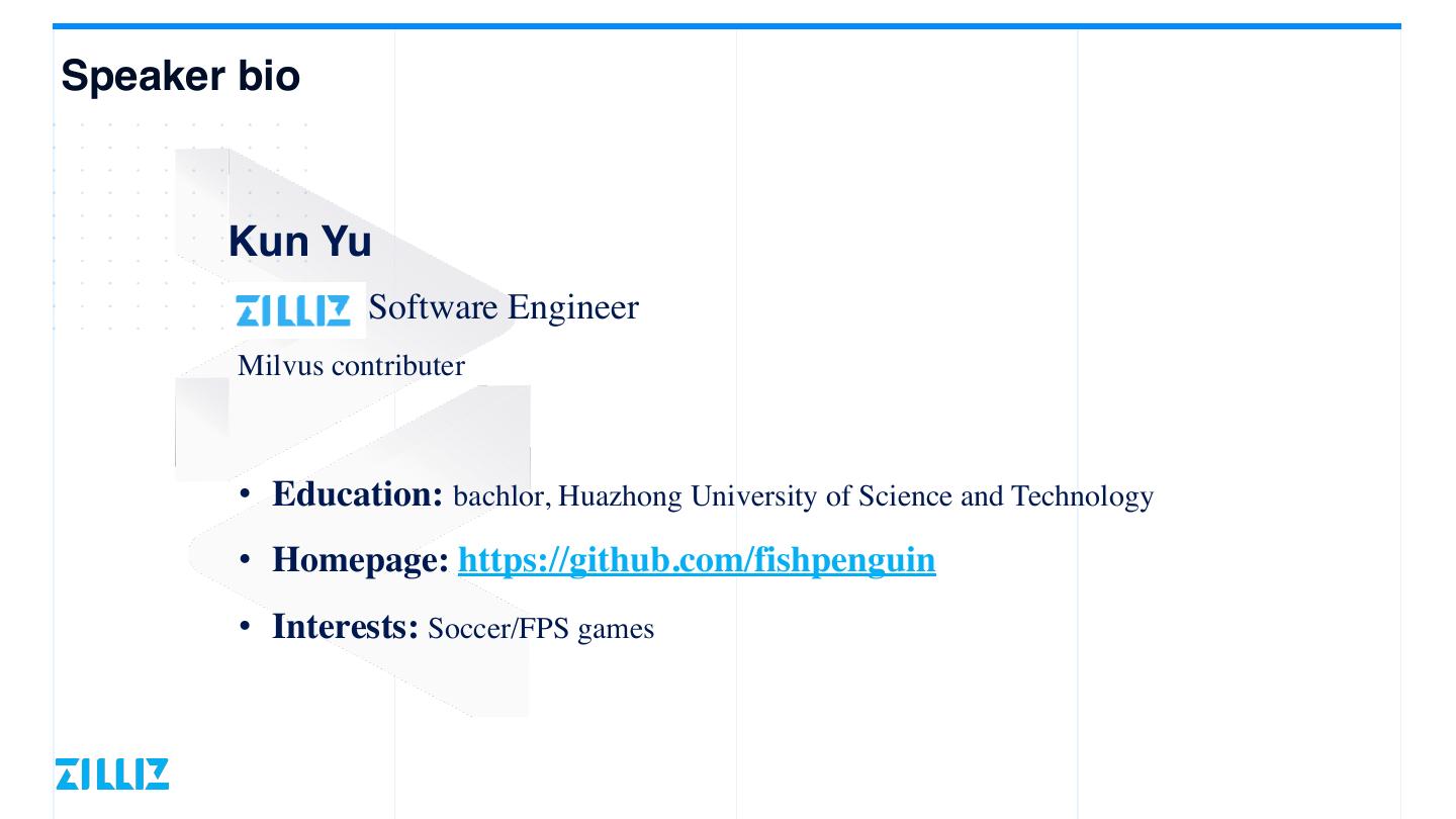 2 .Speaker bio Kun Yu Software Engineer Milvus contributer • Education: bachlor, Huazhong University of Science and Technolog • Homepage: https://github.com/fishpenguin • Interests: Soccer/FPS games y