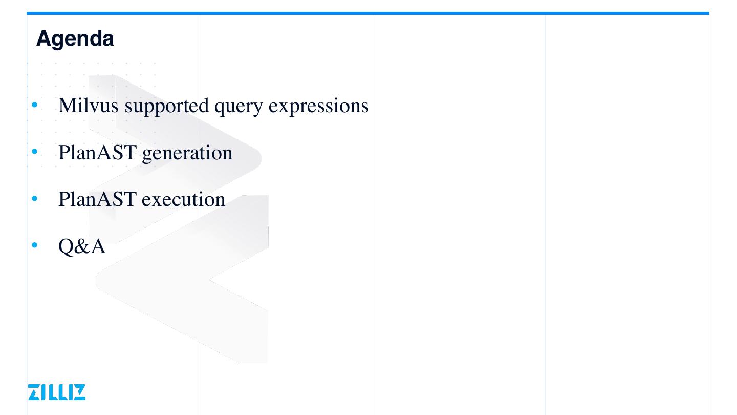 3 .Agenda • Milvus supported query expressions • PlanAST generation • PlanAST execution • Q&A