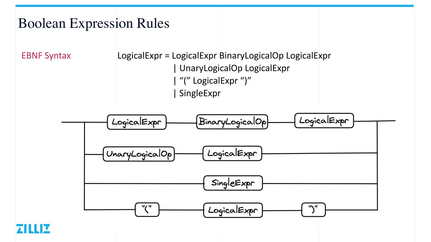 5 .Boolean Expression Rules EBNF Syntax LogicalExpr = LogicalExpr BinaryLogicalOp LogicalExpr | UnaryLogicalOp LogicalExpr | “(” LogicalExpr “)” | SingleExpr