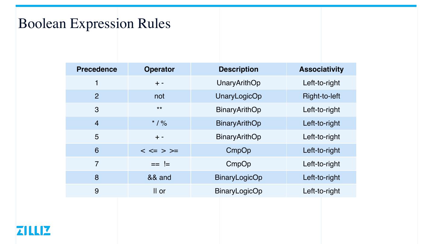 7 .Boolean Expression Rules Precedence Operator Description Associativity 1 +- UnaryArithOp Left-to-right 2 not UnaryLogicOp Right-to-left 3 ** BinaryArithOp Left-to-right 4 */% BinaryArithOp Left-to-right 5 +- BinaryArithOp Left-to-right 6 < <= > >= CmpOp Left-to-right 7 == != CmpOp Left-to-right 8 && and BinaryLogicOp Left-to-right 9 || or BinaryLogicOp Left-to-right