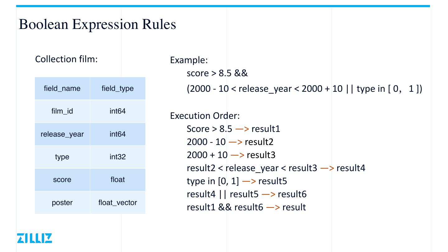 8 .Boolean Expression Rules Collection film: Example: score > 8.5 && field_name field_type (2000 - 10 < release_year < 2000 + 10 || type in [ 0,1 ]) film_id int64 Execution Order: release_year int64 Score > 8.5 —> result1 2000 - 10 —> result2 type int32 2000 + 10 —> result3 result2 < release_year < result3 —> result4 score float type in [0, 1] —> result5 result4 || result5 —> result6 poster float_vector result1 && result6 —> result