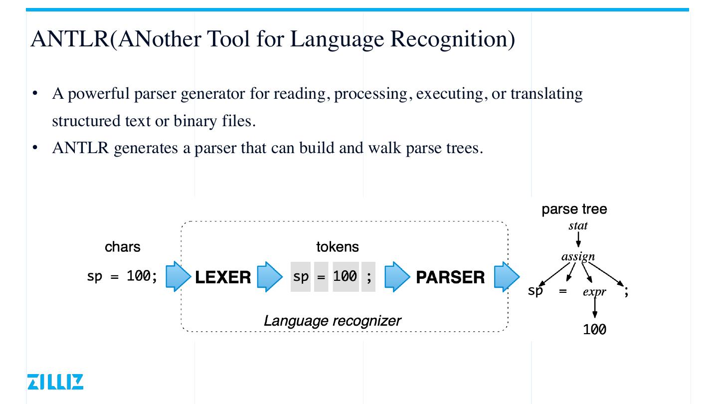 10 .ANTLR(ANother Tool for Language Recognition) • A powerful parser generator for reading, processing, executing, or translating structured text or binary files. • ANTLR generates a parser that can build and walk parse trees.