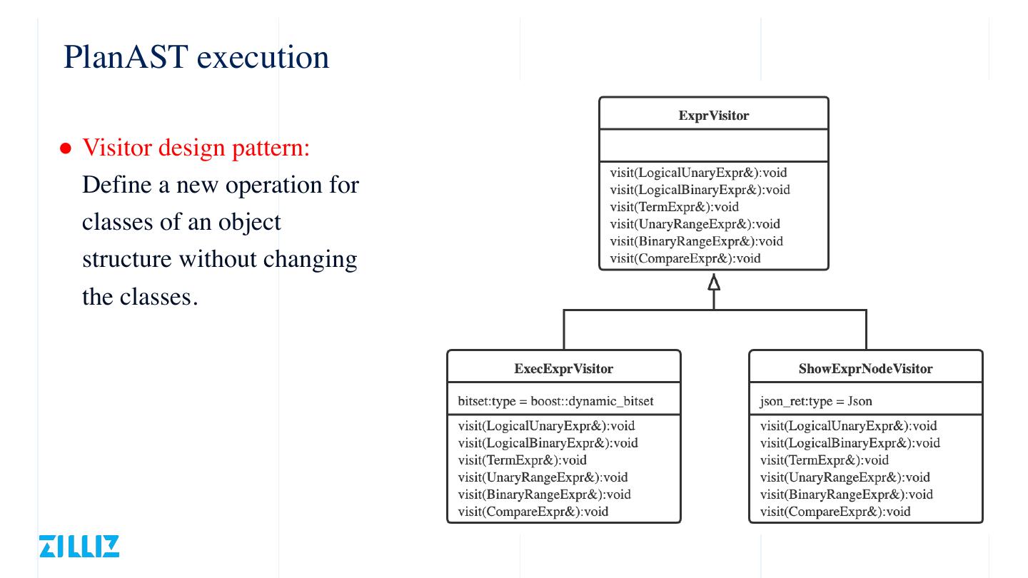 18 .PlanAST execution ● Visitor design pattern: Define a new operation for classes of an object structure without changing the classes.