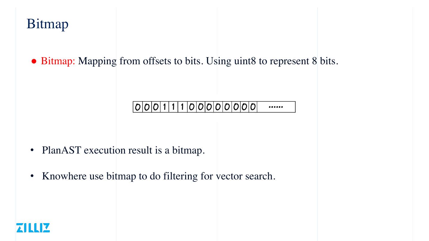 20 .Bitmap ● Bitmap: Mapping from offsets to bits. Using uint8 to represent 8 bits. • PlanAST execution result is a bitmap • Knowhere use bitmap to do filtering for vector search . .