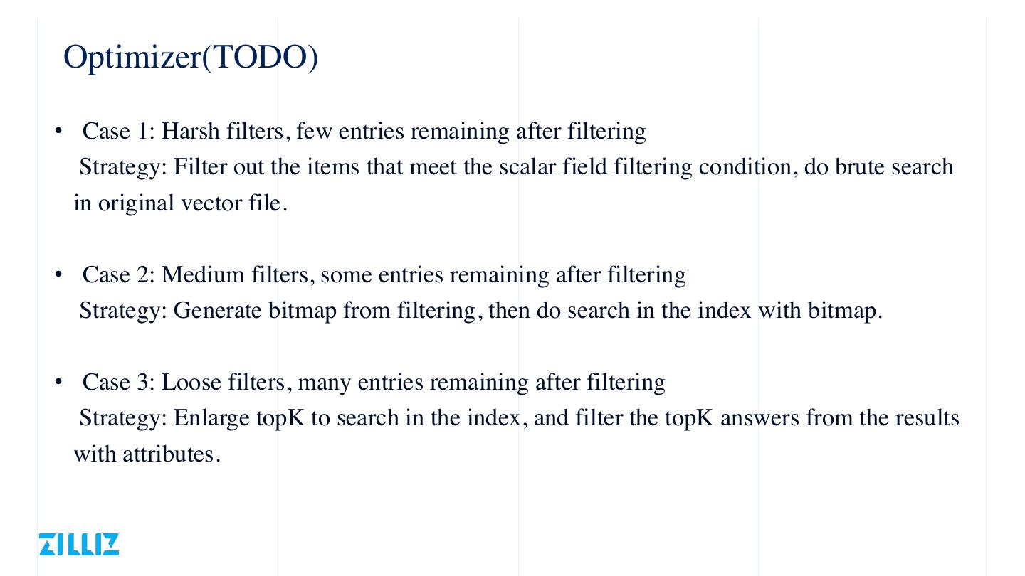 21 . Optimizer(TODO) • Case 1: Harsh filters, few entries remaining after filterin Strategy: Filter out the items that meet the scalar field filtering condition, do brute search in original vector file • Case 2: Medium filters, some entries remaining after filterin Strategy: Generate bitmap from filtering, then do search in the index with bitmap • Case 3: Loose filters, many entries remaining after filterin Strategy: Enlarge topK to search in the index, and filter the topK answers from the results with attributes . . g g g .