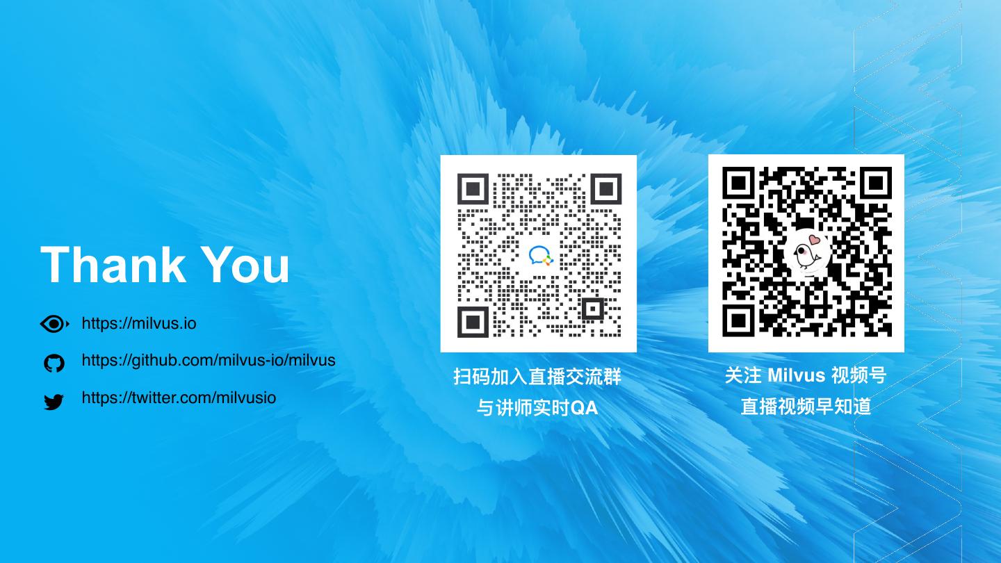 22 .Thank You https://milvus.i https://github.com/milvus-io/milvu 扫码加⼊直播交流群 关注 Milvus 视频号 https://twitter.com/milvusi 与讲师实时Q 直播视频早知道 o A o s
