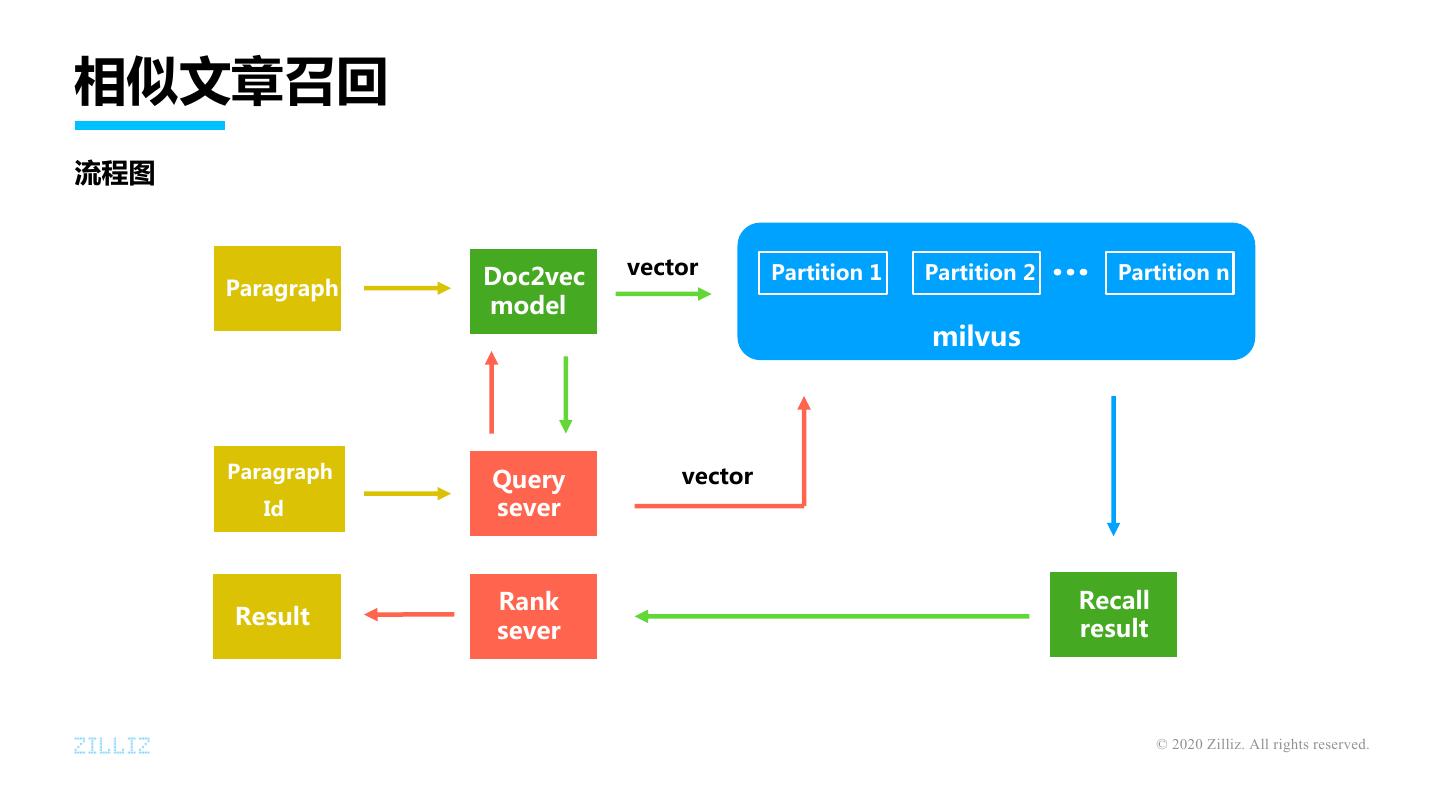 13 .相似文章召回 流程图 Doc2vec vector Partition 1 Partition 2 … Partition n Paragraph model milvus Paragraph Query vector Id sever Rank Recall Result sever result © 2020 Zilliz. All rights reserved.