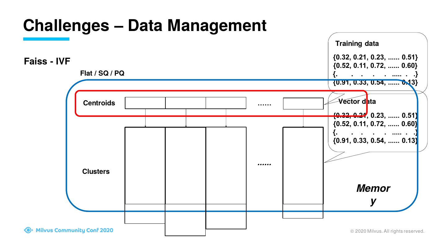 4 .Challenges – Data Management Training data {0.32, 0.21, 0.23, ...... 0.51} Faiss - IVF {0.52, 0.11, 0.72, ...... 0.60} Flat / SQ / PQ {. . . . . ..... . .} {0.91, 0.33, 0.54, ...... 0.13} Centroids …… Vector data {0.32, 0.21, 0.23, ...... 0.51} {0.52, 0.11, 0.72, ...... 0.60} {. . . . . ..... . .} {0.91, 0.33, 0.54, ...... 0.13} …… Clusters Memor y © 2020 Milvus. All rights reserved.