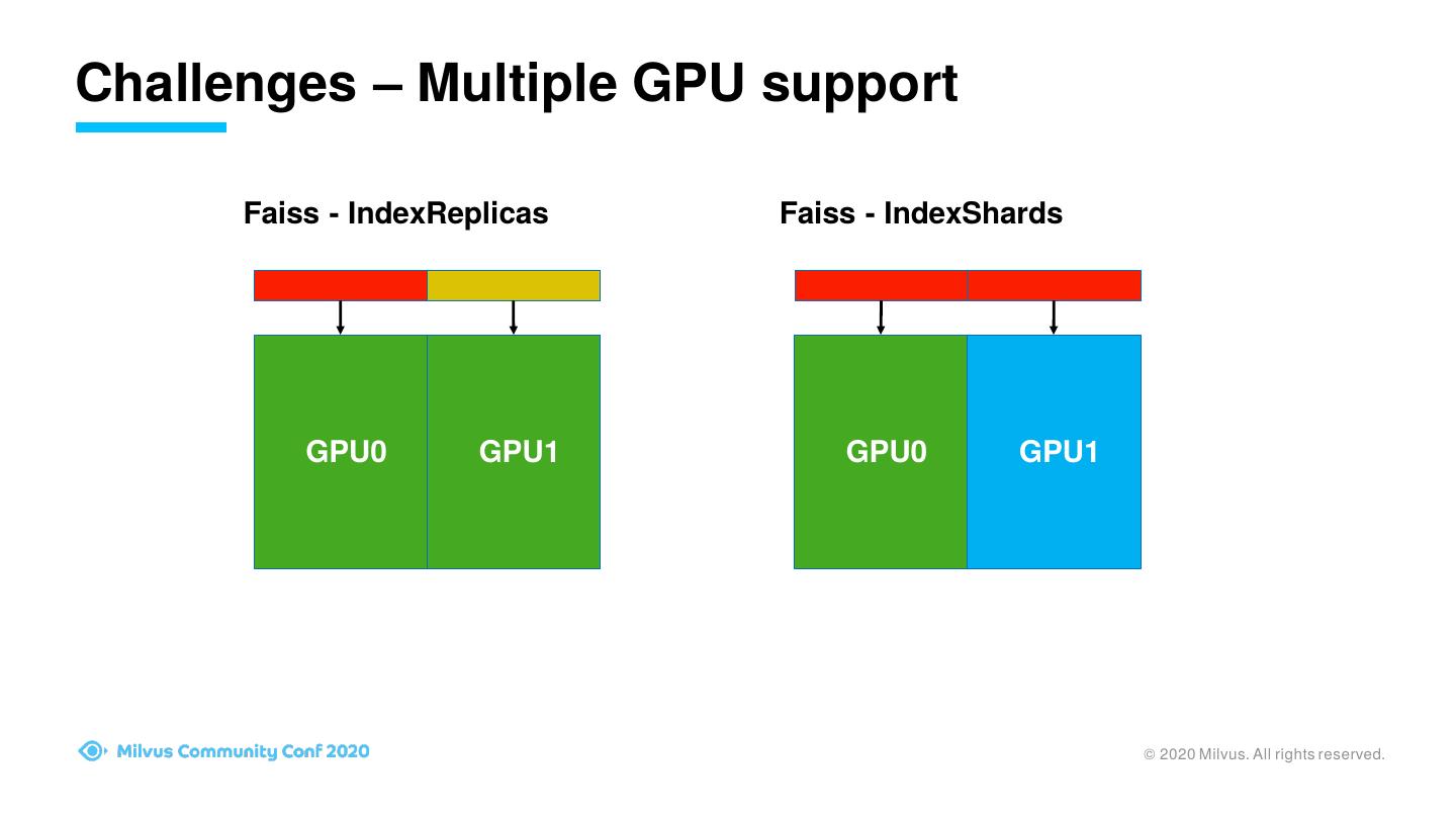 6 .Challenges – Multiple GPU support Faiss - IndexReplicas Faiss - IndexShards GPU0 GPU1 GPU0 GPU1 © 2020 Milvus. All rights reserved.
