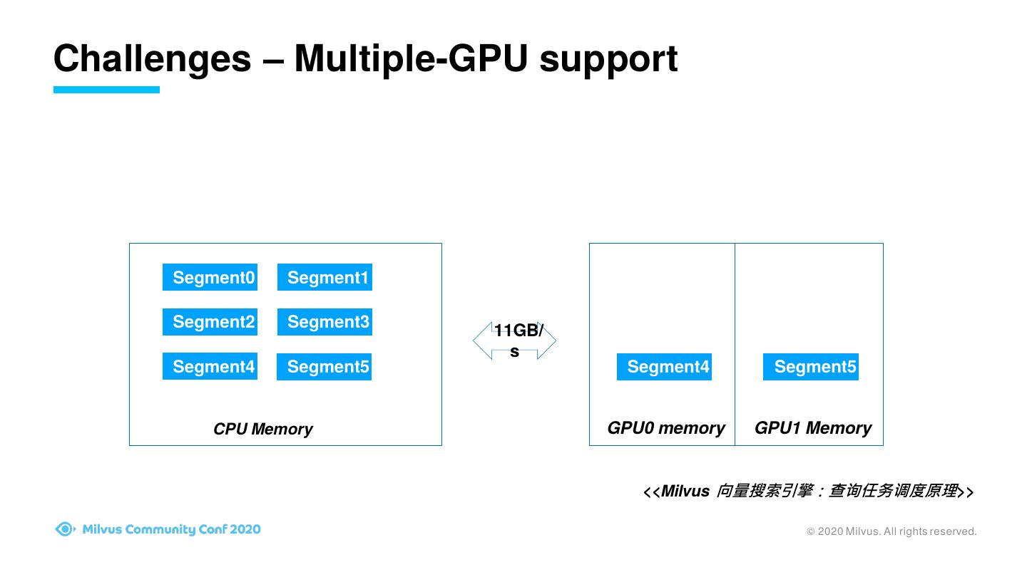 7 .Challenges – Multiple-GPU support Segment0 Segment1 Segment2 Segment3 11GB/ s Segment4 Segment5 Segment3 Segment0 Segment4 Segment1 Segment2 Segment5 CPU Memory GPU0 memory GPU1 Memory <<Milvus 向量搜索引擎:查询任务调度原理>> © 2020 Milvus. All rights reserved.