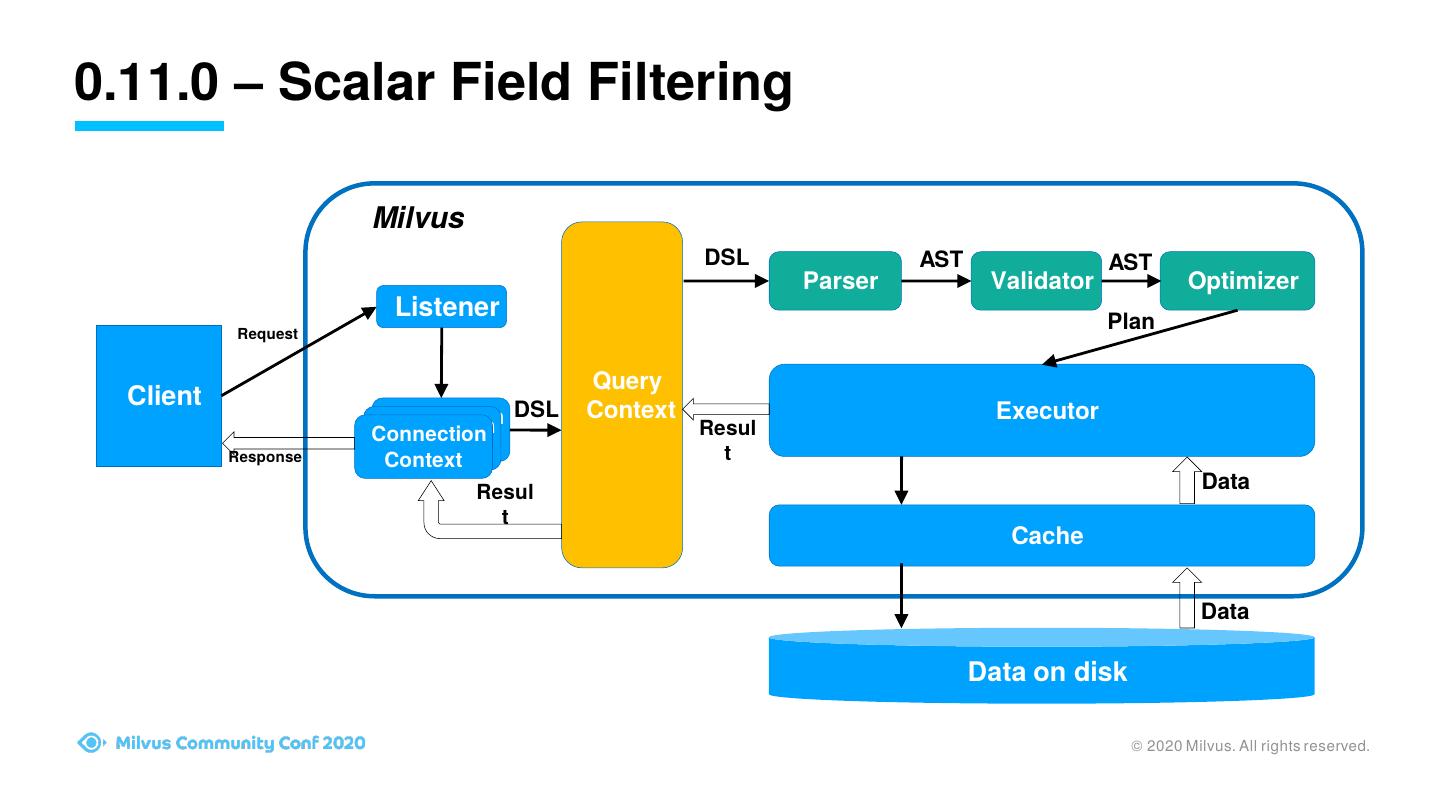13 .0.11.0 – Scalar Field Filtering Milvus DSL AST AST Parser Validator Optimizer Listener Plan Request Query Client DSL Context Executor Connection Connection Connection Resul Context Context Response Context t Resul Data t Cache Data Data on disk © 2020 Milvus. All rights reserved.