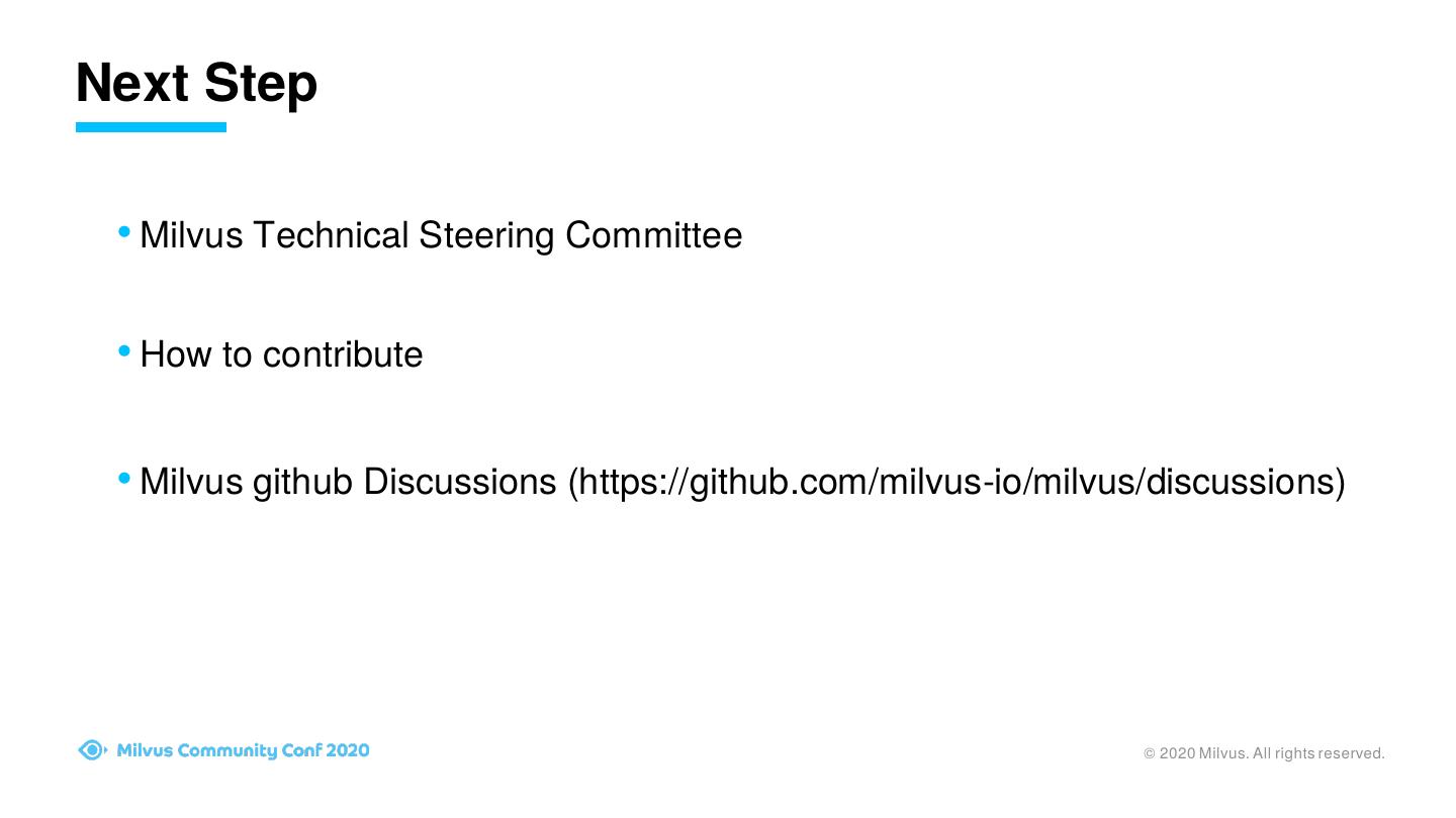 15 .Next Step • Milvus Technical Steering Committee • How to contribute • Milvus github Discussions (https://github.com/milvus-io/milvus/discussions) © 2020 Milvus. All rights reserved.