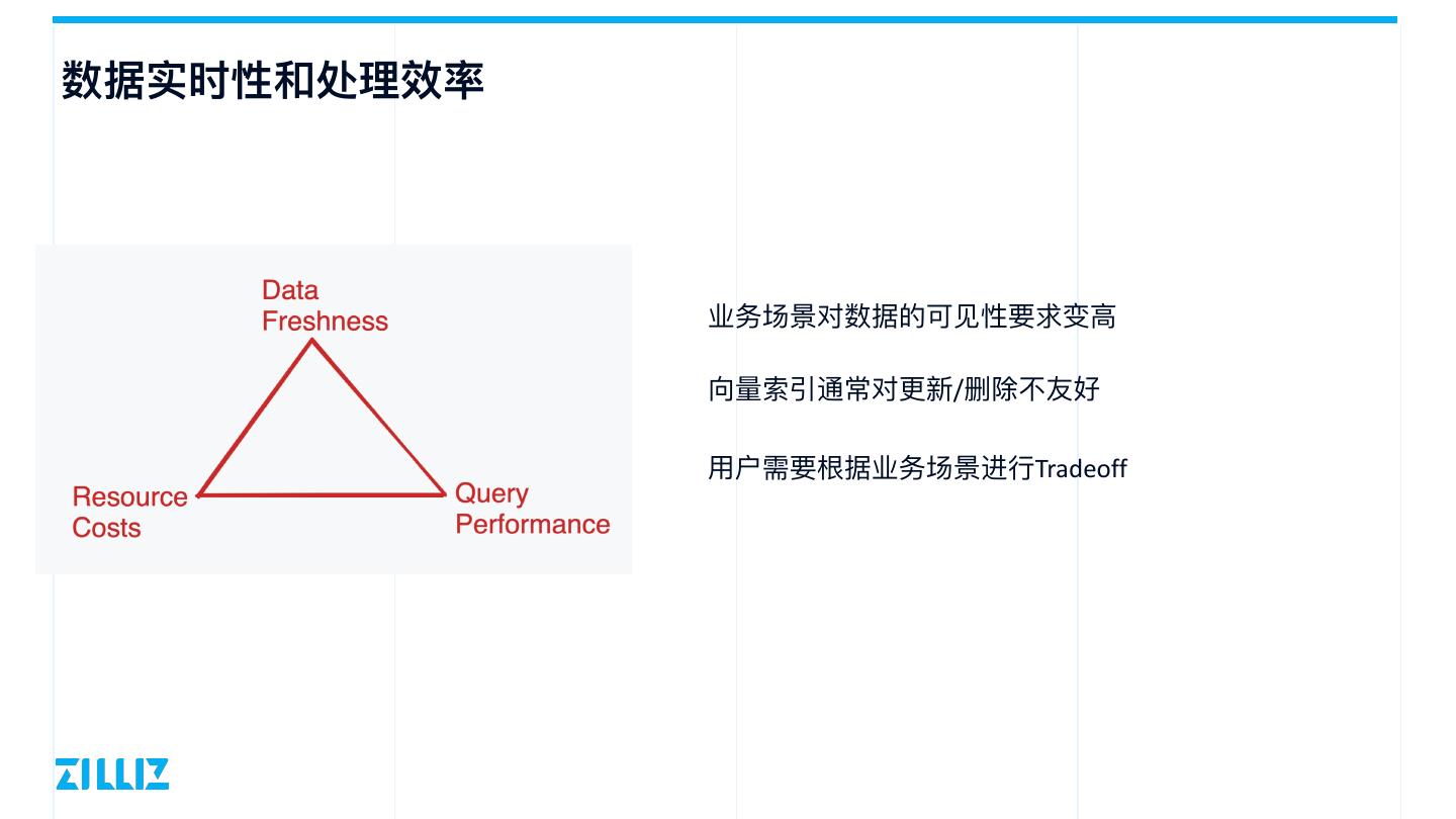 4 .数据实时性和处理效率 业务场景对数据的可⻅性要求变⾼ 向量索引通常对更新/删除不友好 ⽤户需要根据业务场景进⾏Tradeoff