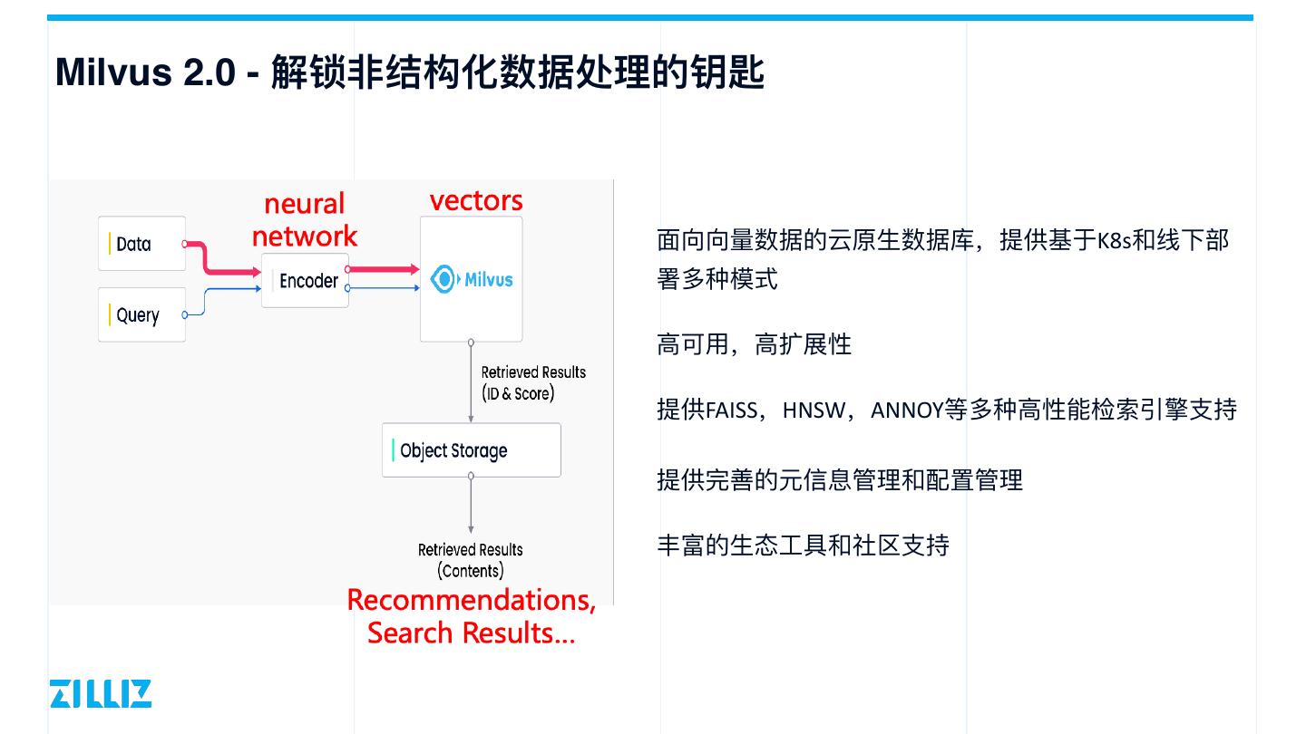 10 .Milvus 2.0 - 解锁⾮结构化数据处理的钥匙 ⾯向向量数据的云原⽣数据库,提供基于K8s和线下部 署多种模式 ⾼可⽤,⾼扩展性 提供FAISS,HNSW,ANNOY等多种⾼性能检索引擎⽀持 提供完善的元信息管理和配置管理 丰富的⽣态⼯具和社区⽀持